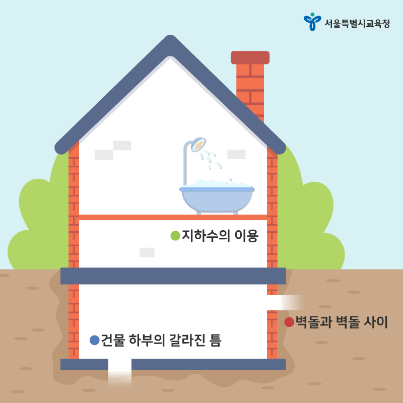 토양에서 발생한 라돈은 건물 바닥의 갈라진 틈이나 벽돌과 벽돌 사이 틈을 통해 실내로 유입될 수 있어요.바닥이나 벽 등에 갈라진 틈이 있는지 살펴보고 보강재 등을 이용해 틈새를 꼼꼼하게 막아주세요.