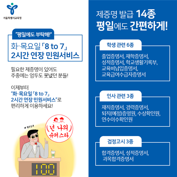 맞벌이 직장인 등 일상생활에 바쁘고 업무시간에 틈을 내기 어려운 시민들을 위해 서울시교육청은 매주 화요일·목요일 오전 8시부터 오후 7시까지 2시간 연장 민원서비스를 실시합니다.