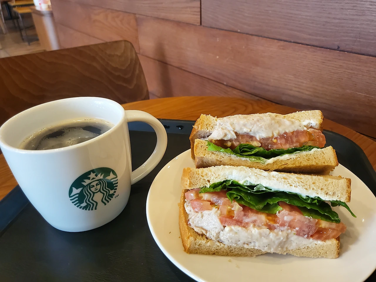 테이블 위엔 아메리카노 한 잔, 그리고 샌드위치 두 조각.