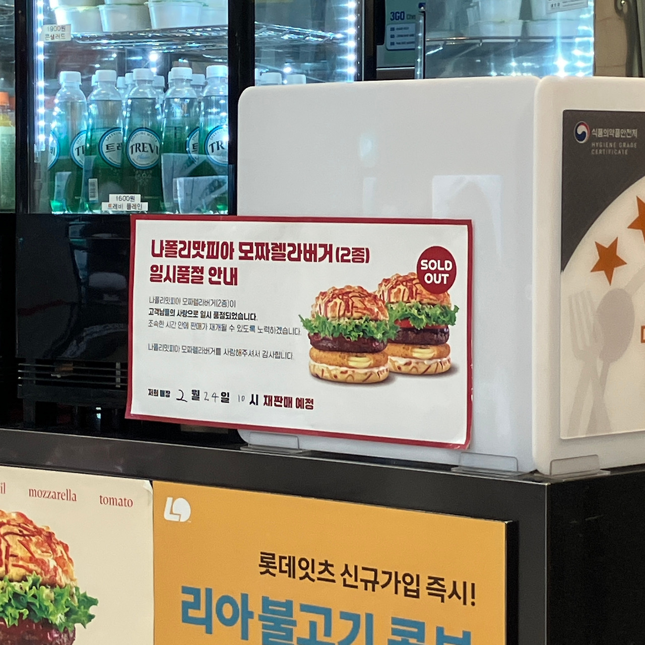 다시 한번 먹어보고, 이 맛을 설명하고 싶었으나, 그날 이후로 나폴리 햄버거를 먹는 것은 불가능했다. 매일 다른 곳에 위치한 매장에 방문했지만, <나폴리아 버거 일시품절 안내, 00월 00일 00시 재판매 예정> 이라는 안내가 출입구에 떡하니 붙어있다. 처음 먹은 날은 운이 좋았던 것이다.