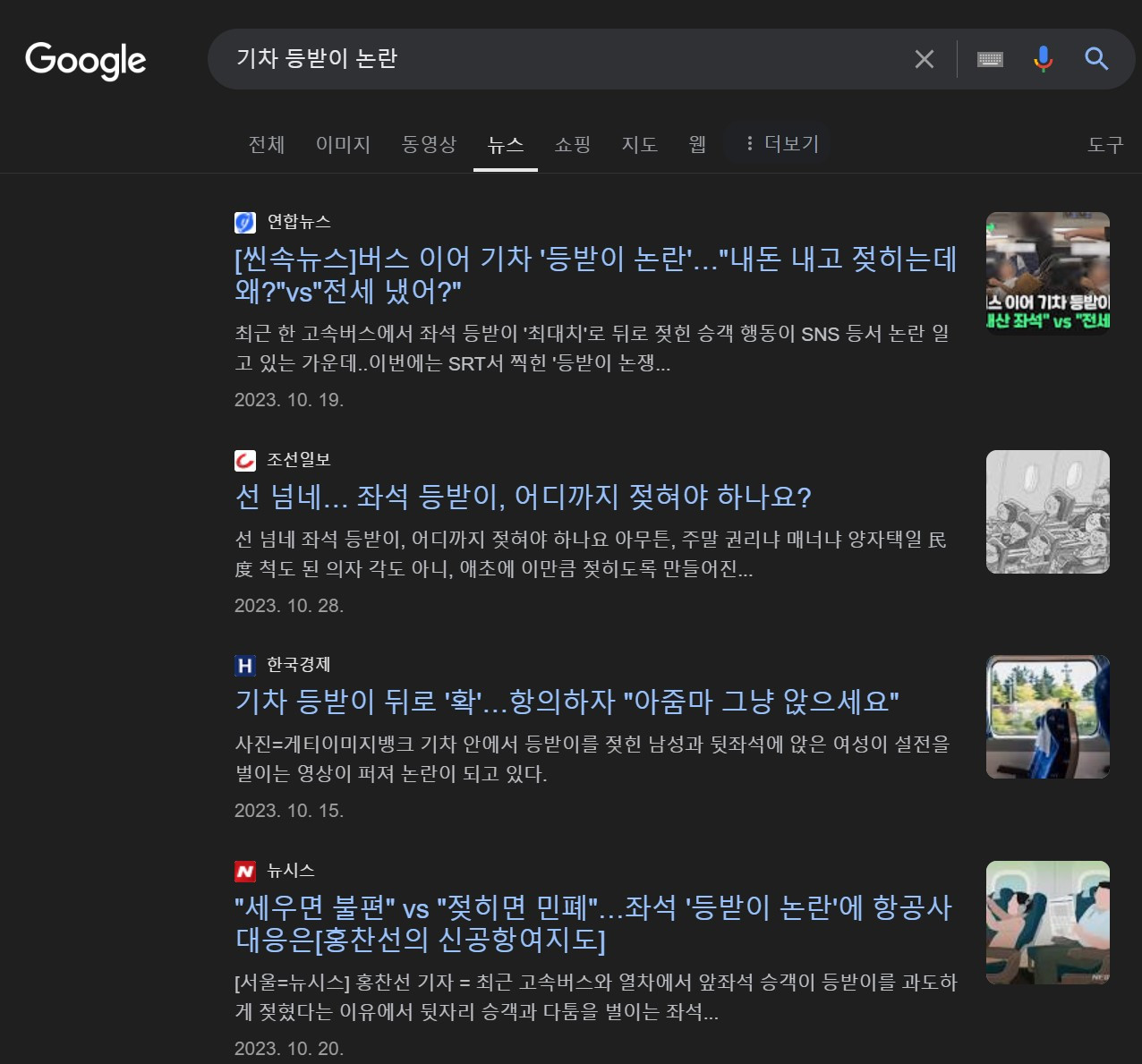 비교적 최근 소식이다. SRT 열차 내에서 기차 등받이를 둘러싼 고성과 욕설이 오갔다. 앞자리 남성이 의자를 뒤로 최대한 젖히자, 뒷자리 여성이 불편하다며 의자를 세워달라고 부탁했다. 곧 두 사람의 의견 충돌은 욕설과 비방으로 이어졌고, 의자를 젖힐 권리에 대해 논란이 일었다. 영상과 녹취록을 보면 남성의 편을 들기는 어렵다. 먼저 욕설을 시작했고 목소리를 높였다. 자신의 뜻을 과격하고 폭력적인 방식으로 주장했기에 분명 문제가 있다.