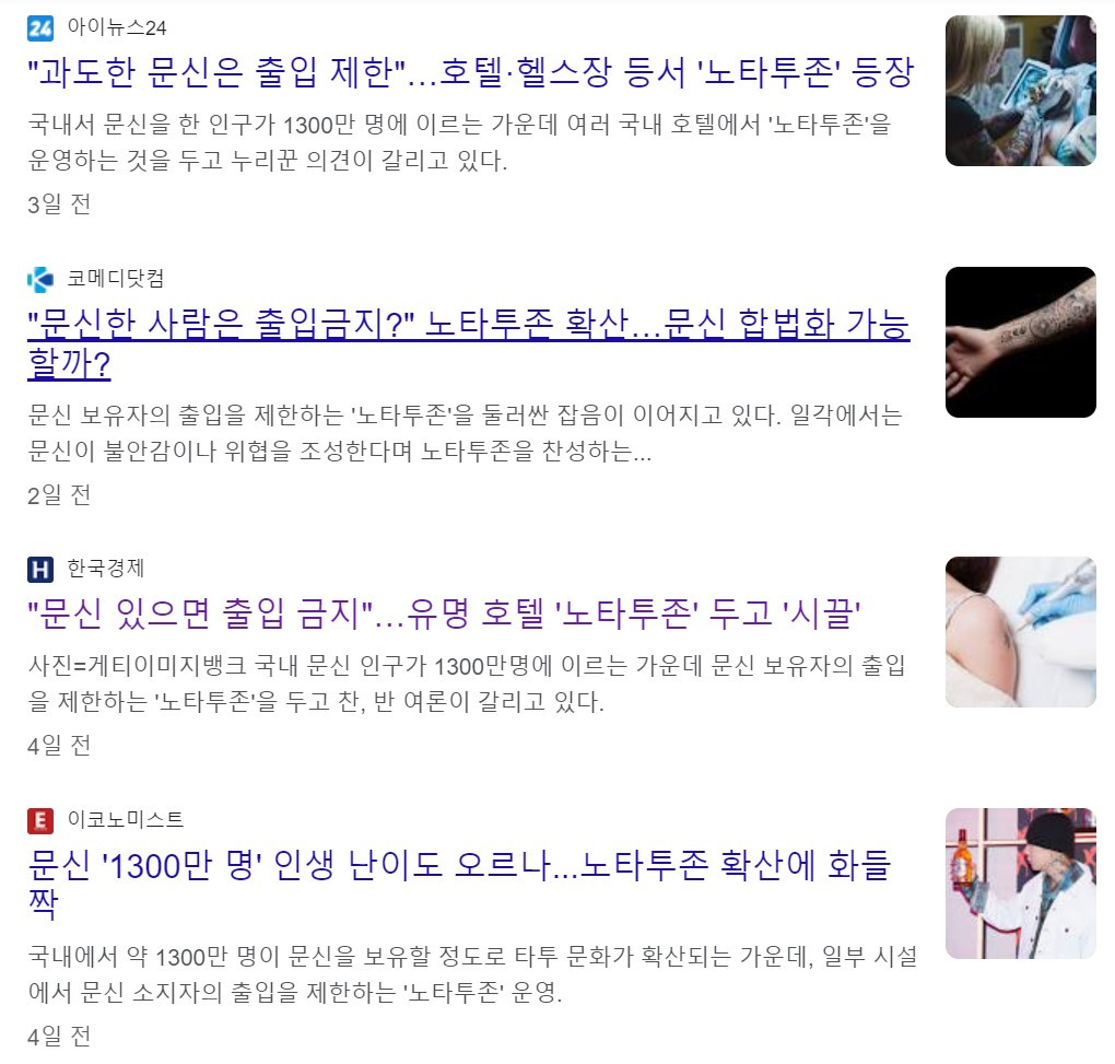 (출처-한국일보 "문신 있으면 출입 금지"… 유명 호텔 '노타투존' 두고 '시끌')