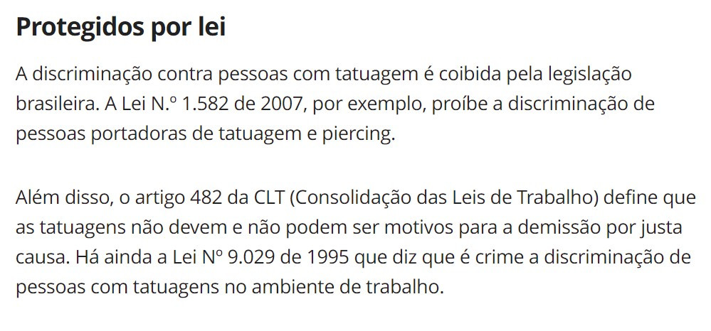 이 외에도, CLT(통합 노동법) 제482조는 문신이 정당한 사유로 인한 해고의 근거일 수 없고 또한 근거가 되어서도 안 된다고 정의하고 있다. 또한 1995년 법률 제9,029호에는 직장 내 문신이 있는 사람에 대한 차별을 범죄로 명시하고 있다.