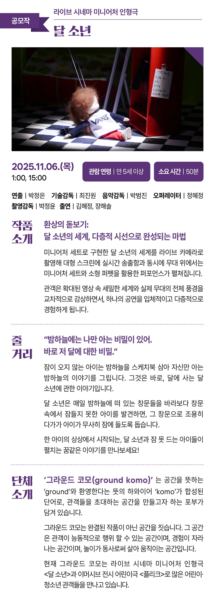 작품 소개 글 앞에 쓰는 홍보문구를 고심했는데 결국 "환상의 돋보기 : 달 소년의 세계, 다층적 시선으로 완성되는 마법'이라고 썼다. 조금 어려울 수도 있지만, 미니어처 세트와 소형 퍼펫을 활용한 퍼포먼스이고 "관객은 확대된 영상 속 세밀한 세계와 실제 무대의 전체 풍경을 교차적으로 감상하면서, 하나의 공연을 입체적이고 다층적으로 경험하게 됩니다."라는 설명글이 있으니 좋은 문구라는 확신이 들었다.