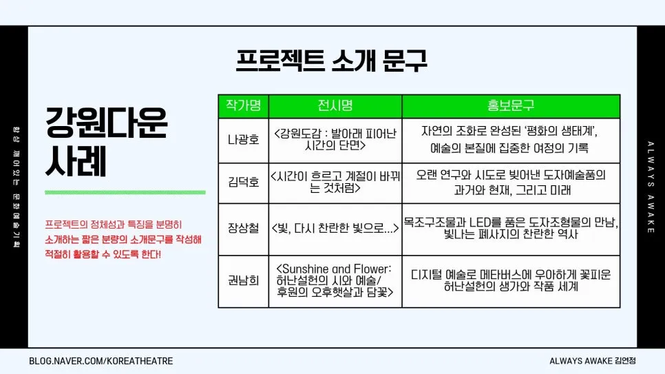 공연팀에게 받은 기본 자료를 분석하고, 이를 효과적으로 설명하거나 알릴 수 있는 홍보문구를 팀원과 내가 각각 작성해오고 이를 투표에 부쳐 최종적으로 결정하는 방식이었다.