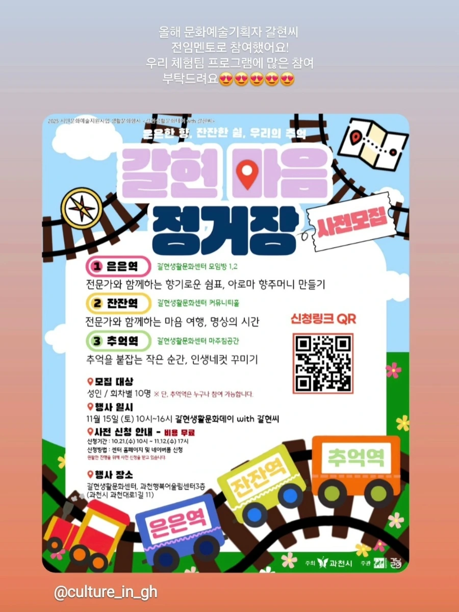 그럼 프로그램은 나왔고, 여기에 컨셉을 부여해 볼 시간이다. 여기서 나는 세 가지 프로그램에 맞춰 '역' 컨셉으로 하면 어떻겠냐는 조언을 했다. 은은역-잔잔역-우리역 이렇게. 역에 정차하듯이 쉬어가는 마음으로 즐겨주셨으면 좋겠기에. 여행하는 느낌도 들고 말이다. 그래서 프로그램명도 '갈현 마음 정거장'이 되었다. 힐링을 컨셉으로 하는 프로그램에 딱 맞는 제목이다.
