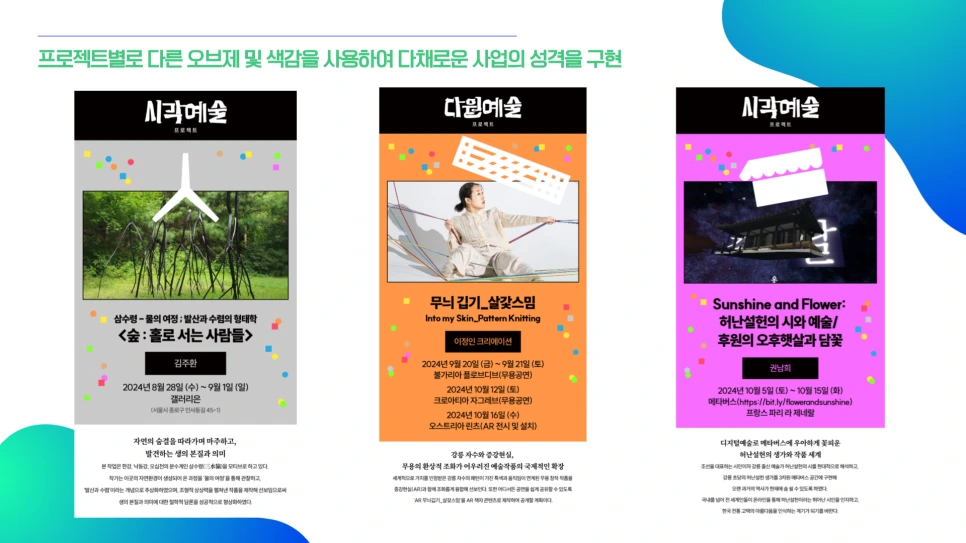 전시 <숲 : 홀로 서는 사람들>은 '자연의 숨결을 따라가며 마주하고, 발견하는 생의 본질과 의미', <무늬 깁기_살갖스밈>은 '강릉 자수와 증강 현실, 무용의 환상적 조화가 어우러진 예술작품의 국제적인 확장' , <Sunshine and Flower: 허난설헌의 시와 예술/후원의 오후햇살과 담꽃>은 '디지털예술로 메타버스에 우아하게 꽃피운 허난설헌의 생가와 작품 세계'라고 썼다.