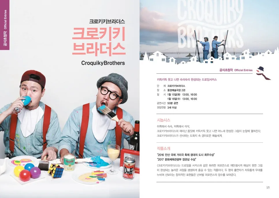 크로키키브라더스의 <크로키키 브라더스>는 '드로잉서커스'라는 장르를 표방했는데, 이 장르는 관객들에게 낯설게 다가갈 것이라는 생각이 들었다. 공연 자료를 열심히 읽고, 공연 영상을 찾아본 이후에 공연과 장르를 어떻게 쉽게 설명할 수 있을까 고심했다. 공연은 재미있었고, 공연이 종료될 때는 드로잉이 완성되어 있었다. 이 구성을 의성어나 의태어로 표현하면 관객이 더 쉽게 이해할 것이라 생각해 '키득키득 웃고 나면 슥삭슥삭 완성되는 드로잉 서커스'라고 적었다. 회의 동안 투표한 결과, 내가 작성한 홍보문구가 최종 카피가 되었다.