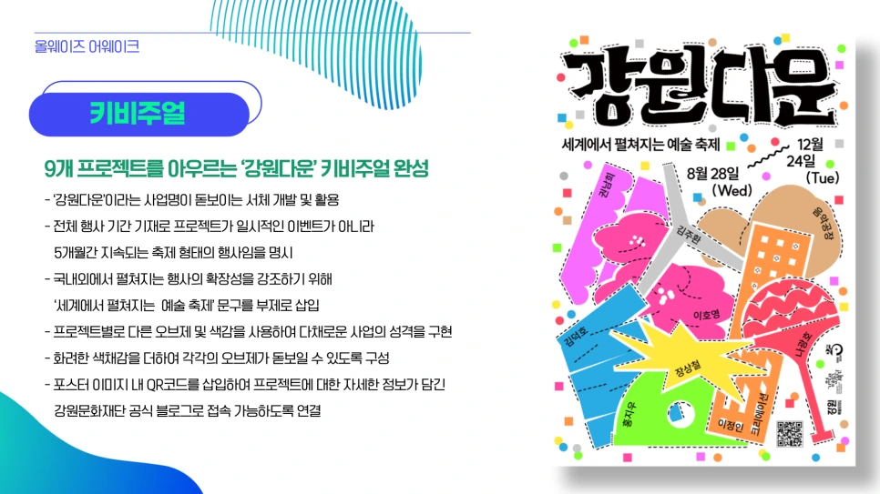 여기서 강원문화재단 강원문화자원 활용 작품개발지원 <강원다운> 사례도 소개해 볼까 한다. 키비주얼 작업은 인볼드 스튜디오의 박기현 대표님이 해주셨는데, 우선 '강원다운'이라는 사업명이 돋보이는 서체를 만들어 주셨다. 그리고 9개 프로젝트별로 다른 오브제 및 색감을 사용하여 각 프로젝트의 강점과 개성을 강조했다.