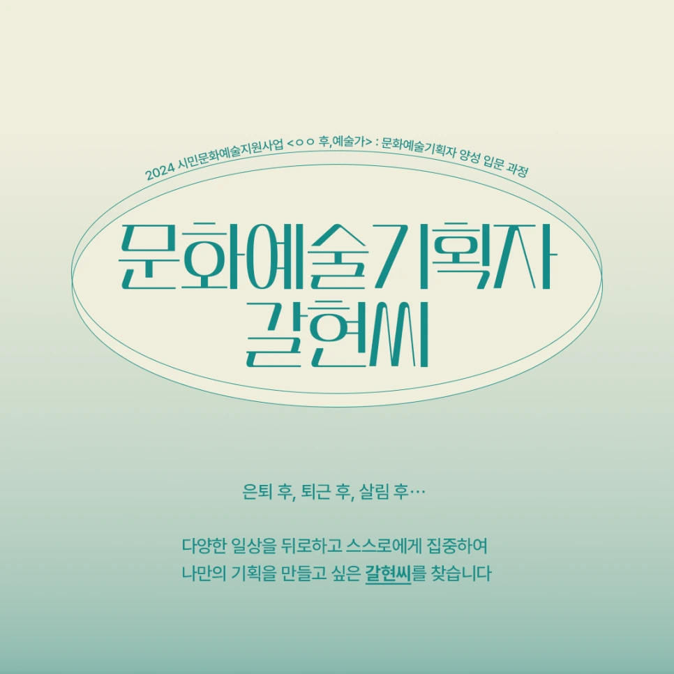 '문화예술기획자 갈현씨' 작명을 할 때도 그랬다. 얼마나 많은 제목을 썼다 지웠다 했는지 모른다. 사람들이 홍보물을 볼 때 가장 중요한 것이 바로 제목이기 때문이다. 갈현생활문화센터가 개관한지 얼마 되지 않은 상황이었고, 개관 후 처음으로 진행하는 프로젝트였기에 '갈현'이라는 키워드가 두드러지길 바랐다. 그리고 갈현동 주민이 많이 와줬으면 하는 바람에 '문화예술기획자 갈현씨'라는 이름을 붙인 것이다. 작명하느라 고생은 했지만, 프로그램명이 좋다는 평가를 많이 받았기에 아직도 뿌듯하게 생각하고 있다.