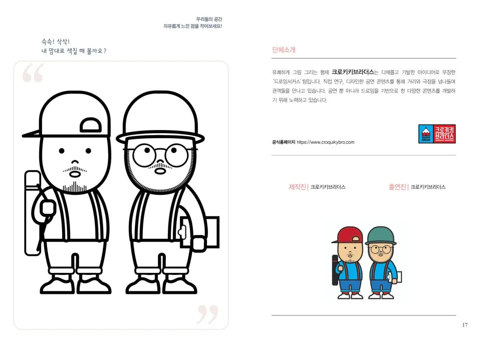 앞에 슥삭슥삭이란 표현을 썼으니 크로키키브라더스의 캐릭터를 그려보는 체험을 프로그램북에 넣으면 좋겠다는 아이디어를 냈고, 이것이 반영됐다.