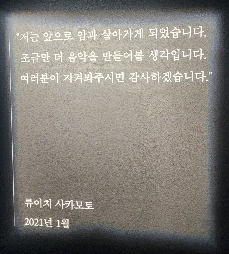 류이치 사카모토는 암 판정을 받고, 다음과 같이 발표한다. 앞으로 암과 살아가게 되었노라고. 조금만 더 음악을 만들어볼 생각이라고. 그리고 여러분이 지켜봐 주시면 감사하겠노라고. 암을 부정하지 않고 받아들이나, 그럼에도 불구하고 음악의 끈을 놓지 않겠다고 선언한 것이다.