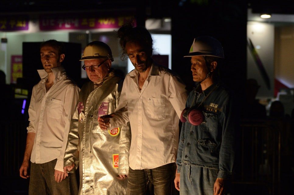 한불 합작 공연 <철의 대성당>입니다. 프랑스의 댄스 컴퍼니 오스모시스와 함께 만든 첫 번째 작품으로 산업노동자를 소재로 한 거리예술 작품이었습니다. 실제 산업노동자로 일한 경험이 있는 분을 섭외해 공연에 출연하게 하였고, 크레인과 나무빔, 화약 등을 사용해 산업현장의 생생함을 그대로 묘사하고자 했습니다. 프로젝트 준비 전부터 오랜 리서치와 준비 기간을 거쳤고, 한국과 프랑스, 독일을 오가며 작품을 완성했습니다.