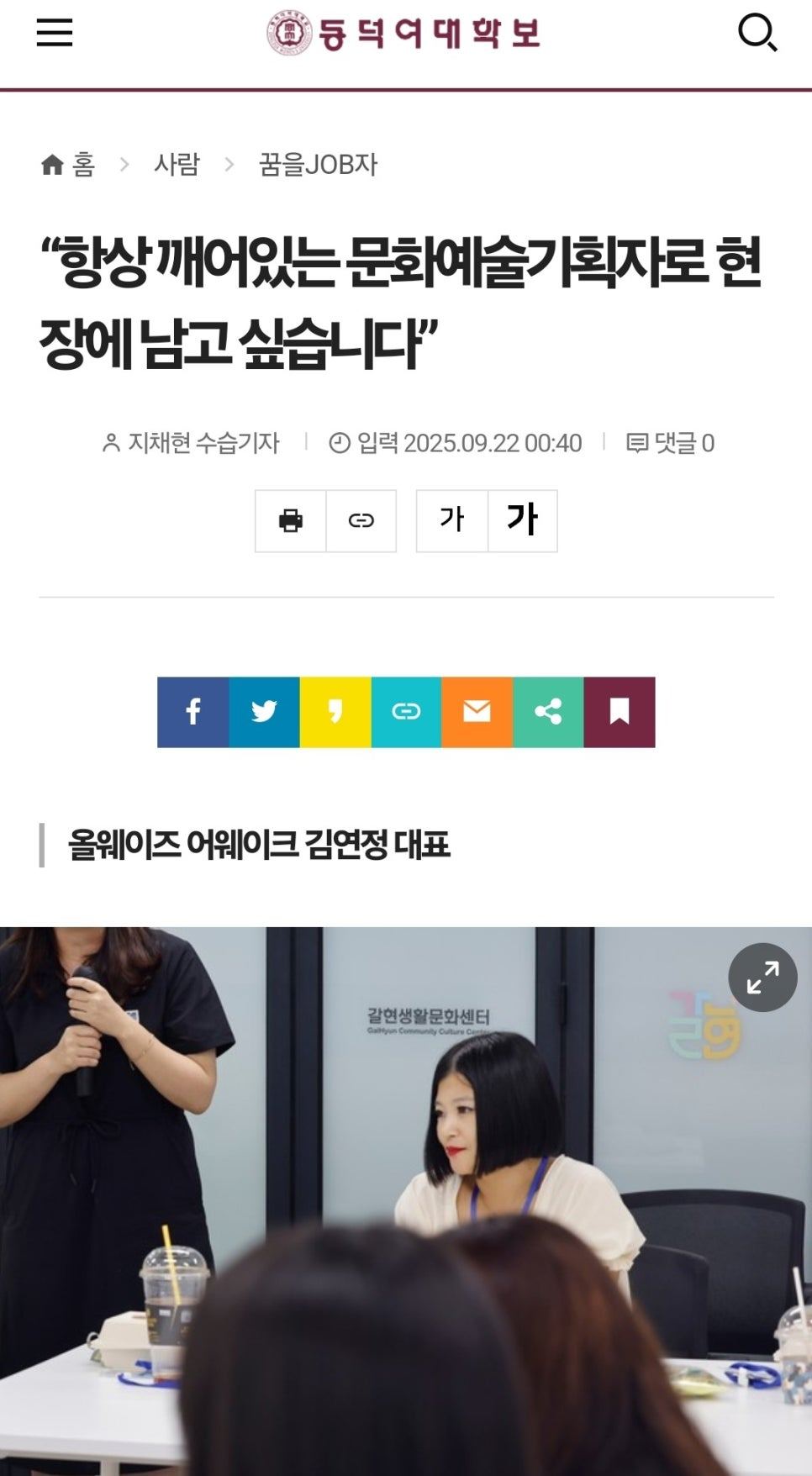 그런데 얼마 전 동덕여대학보사에서 인터뷰 요청을 받았습니다. 바로 동덕여대학보 8면의 '꿈을 JOB자'라는 섹션인데요. 자칭 '덕업일치 문화예술기획자'로서 학생들과 예비 기획자를 대상으로 교육을 많이 해온 만큼 제게는 더욱 특별한 요청으로 다가왔습니다.