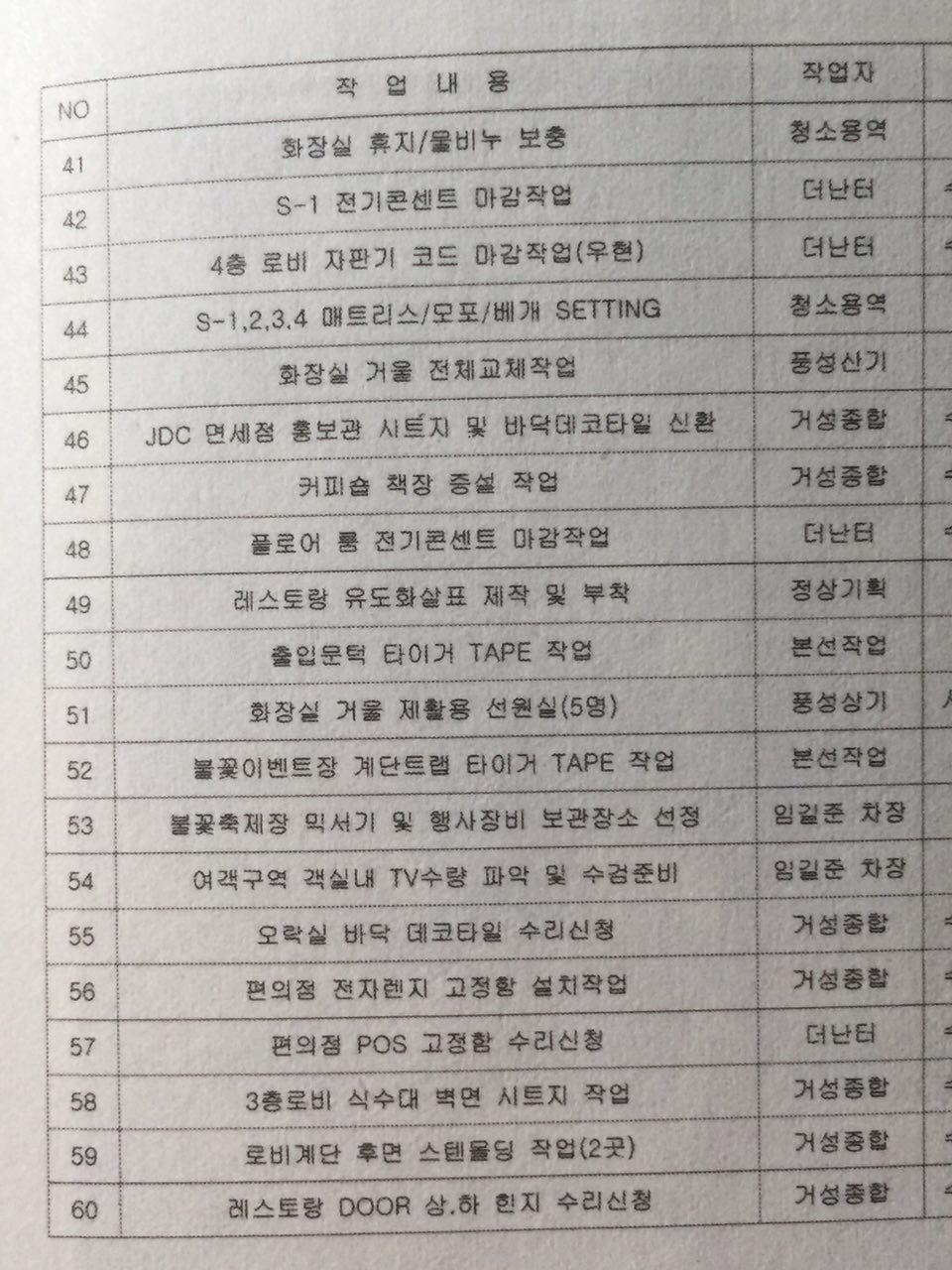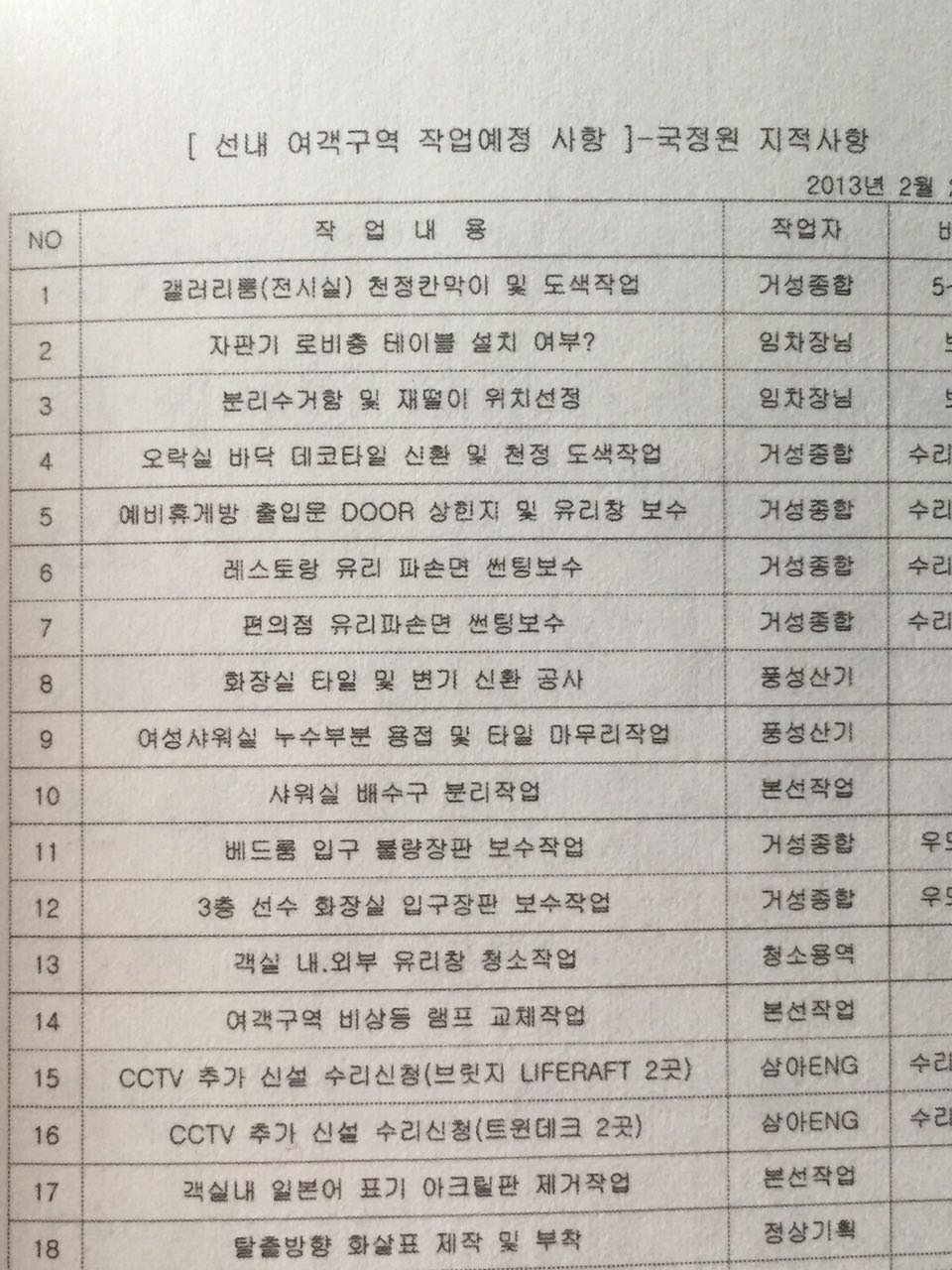 드디어 국정원이 자기 이름을 음지에서 양지로 드러내는 순간이었다. 그런데 100가지의 지적은 우습게도 천정 도색작업, 재떨이 위치 선정, 유리창 선팅, 안내방송 멘트 준비, 침대 불량 교체, 화장실 거울 교체, 샤워실 중간밸브 불량, 2월 작업수당 보고서 작성 같은 배수리 및 직원 관리 내용이었다.
