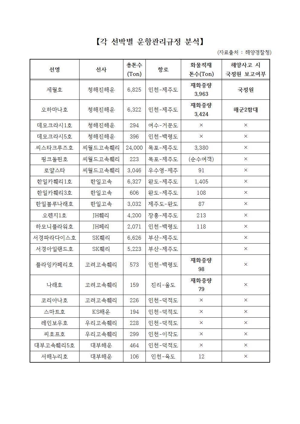 우리 의원실은 좀 더 확실하게 연관성을 찾기 위해 서해를 운항하는 여객선에 대한 전수조사에 들어갔다.