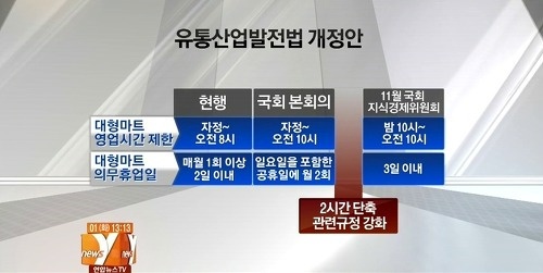 이 최소한의 요구가 상임위 여야협상 과정에서 새누리당의 주장에 밀려 10시-10시로 결론이 났다. 새누리당은 중소상인과 대형마트의 이해관계를 절충하는데 성공한 셈이다. 그런데 이것도 받을 수 없다고 법사위에서 개정안 통과를 막았던 것이다.