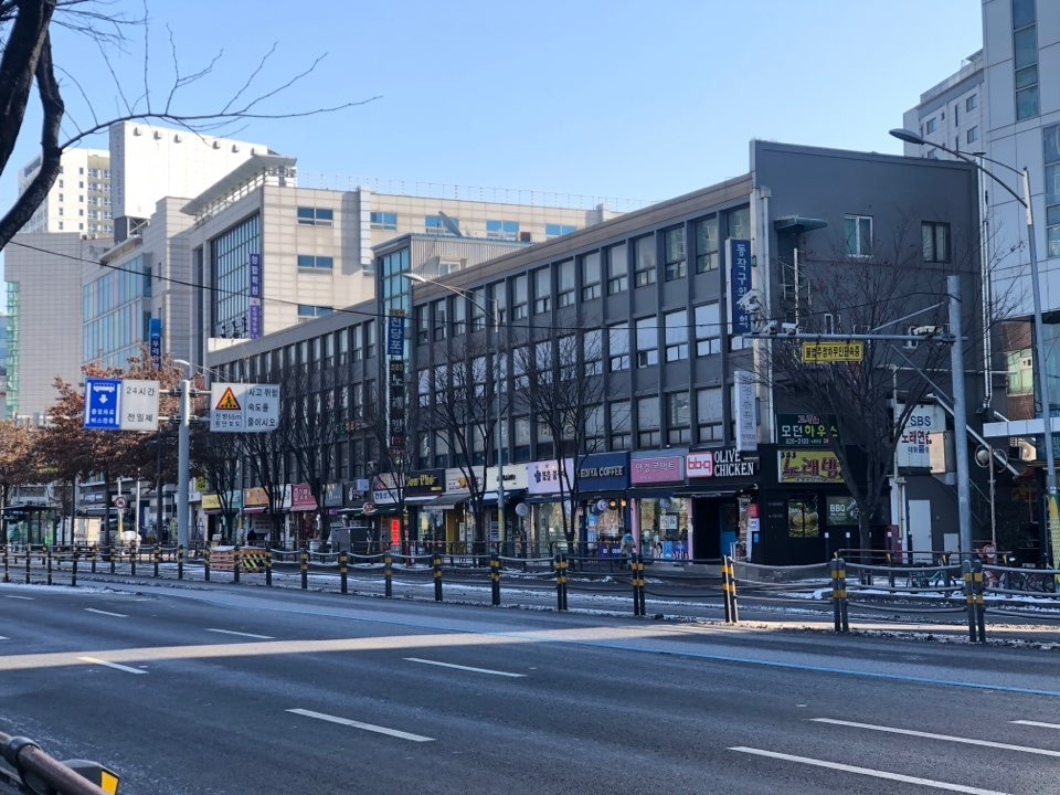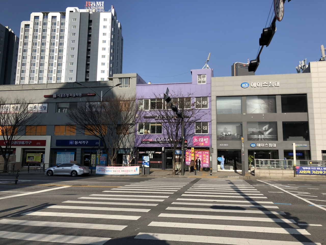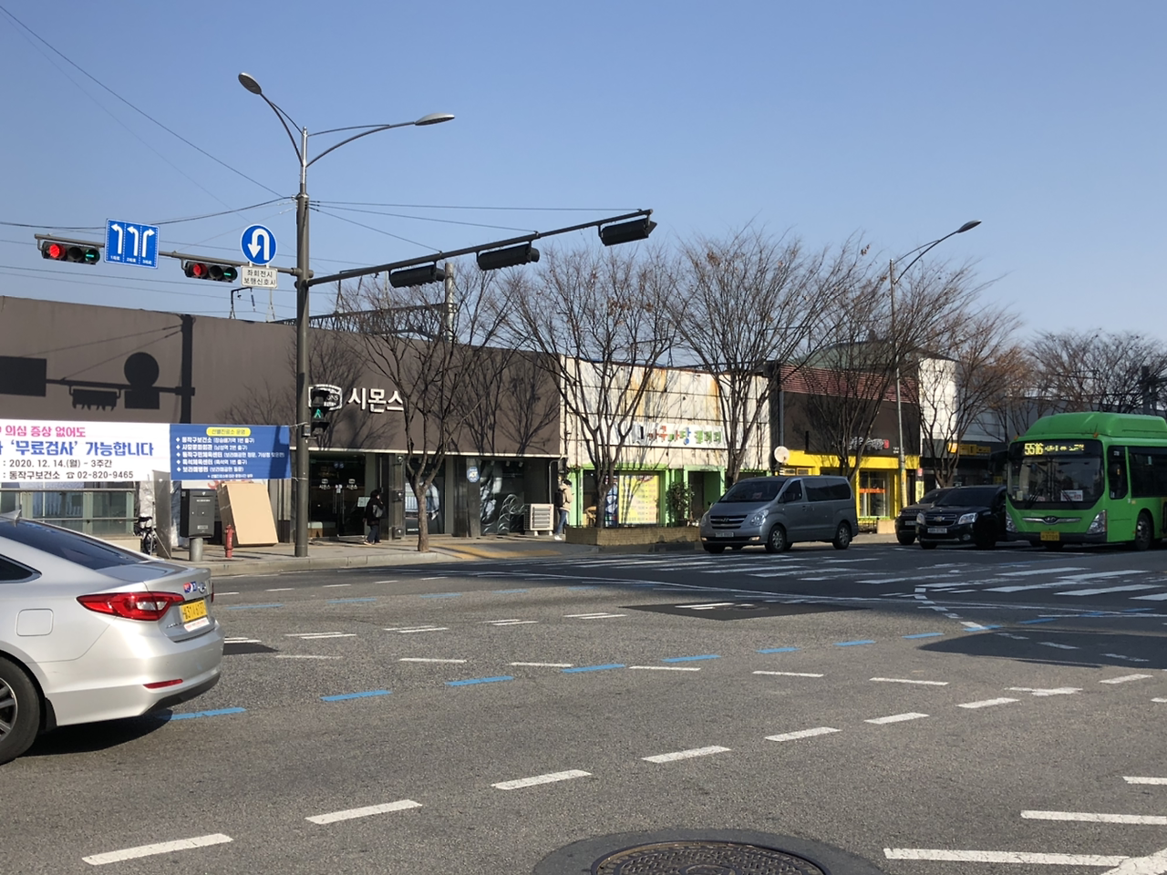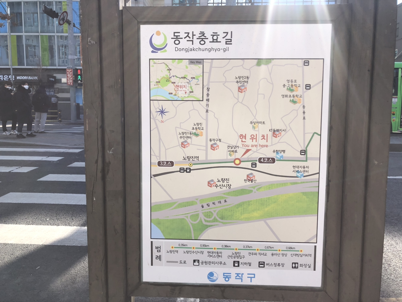 가까운 횡단보도 앞에는 동작구의 동작 충효길을 안내하는 지도 표지판이 설치되어 있다. 주민센터, 학교, 구청, 아파트, 전화국(KT) 등의 생활기반 시설과 유한양행, 현대자동차서비스센터, 노량진 수신시장, 한국물산과 같은 지역에 영향을 미치는, 잘 알려진 장소들이 표기되어 있다. 그 와중에 '건설 상가아파트'가 표기되어 있다는 건 무엇을 의미하는 것일까? 아파트라서? 학원과 시장 건물을 제하고 봤을 때 주변에서 가장 눈에 띄는 건물이기도 하다.