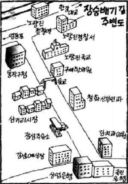 왼쪽으로 꺾어 장승배기로 가는 이들에게 전하고 싶은 것은 건물이다. 사실 장승배기까지 도착하는 여정에 딱히 특별하거나 흥미를 끌 만한 것은 보이지 않는다. 대신 이곳은 세월의 변화를 크게 맞이 하지 않아 과거를 좀 짚어볼 만하다는 점에서 의미가 있는 곳이다. 도로변에는 아직도 저층의 건물들이 서로가 벽을 맞대고 의지하며 서 있다. 반은 창문이고, 반은 간판과 글씨로 가득 차 있다.