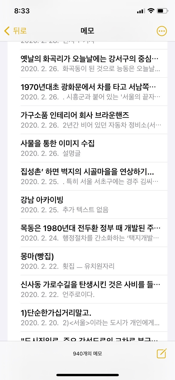버스를 타고 가다가 목적지에서 내리는 것이 아니라 일부러 몇 정거장 앞에서 내려 걸어갔다. 직접 걸으며 보는 것과 버스를 타고 가면서 보는 것에 있어 차이가 존재하기 때문이다. 그러면서 자연스럽게 그동안 알지 못했던 장소를 발견하기도 하고, 존재했지만 사라진 공간과 그 자리에 새로 생긴 공간도 살펴보게 되었다.