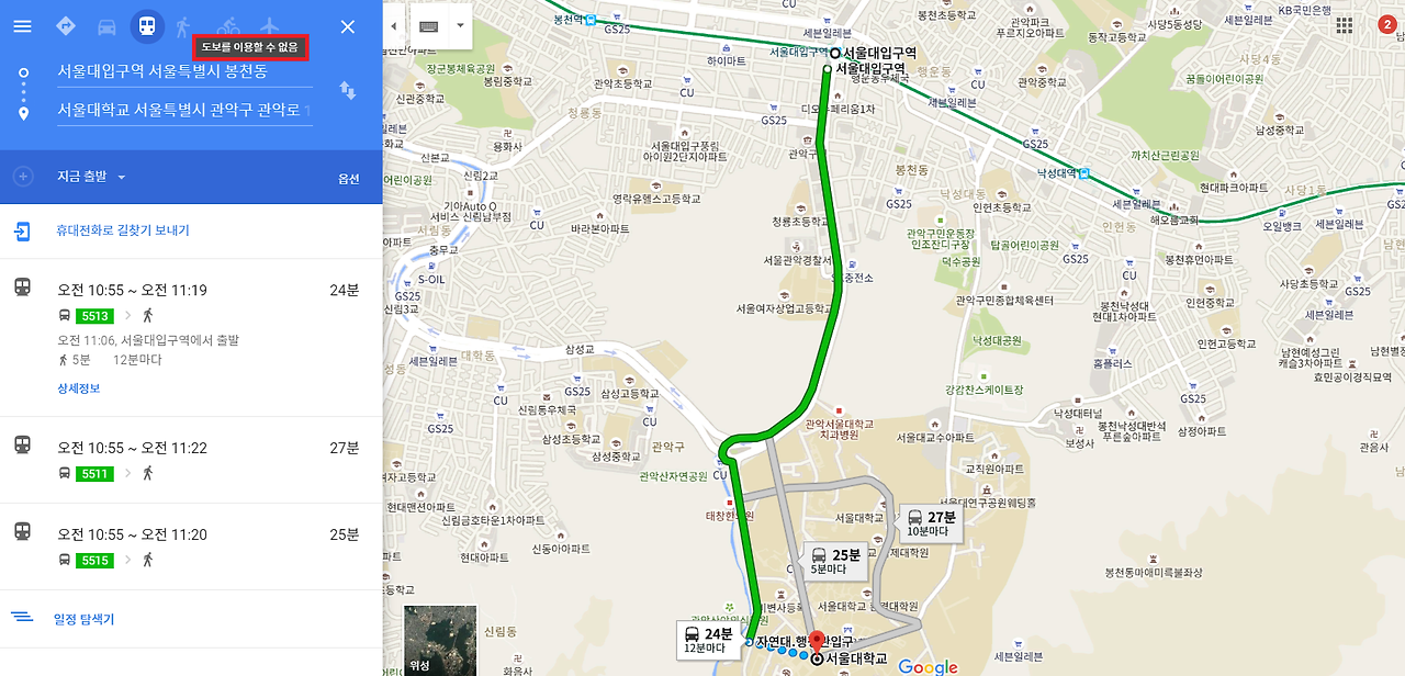 구글지도로 검색하니 가장 먼저 버스로 24분~27분이 소요되고 도보로는 이용할 수 없다는 결과가 나왔다.