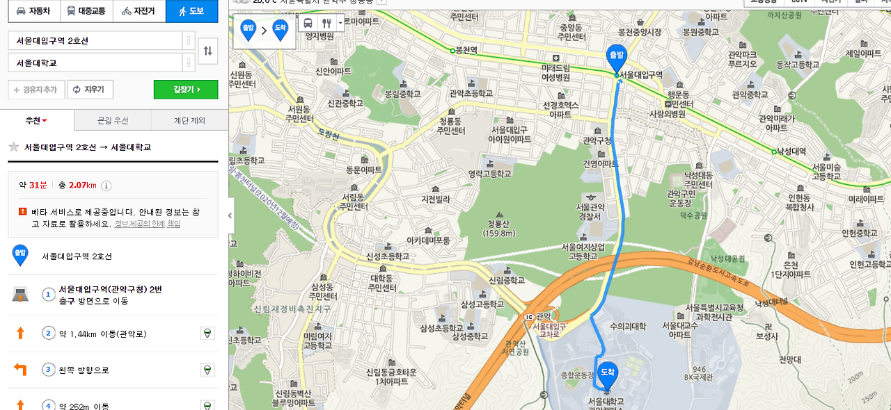 여기서 중요한 것은 구글이든, 네이버든 간에 서울대입구역에서 서울대학교까지 실제 도보거리는 약 30분 정도이며 서울대입구역은 진짜 서울대입구역이 아니라는 것이다. 이 말을 전하고 싶었다.