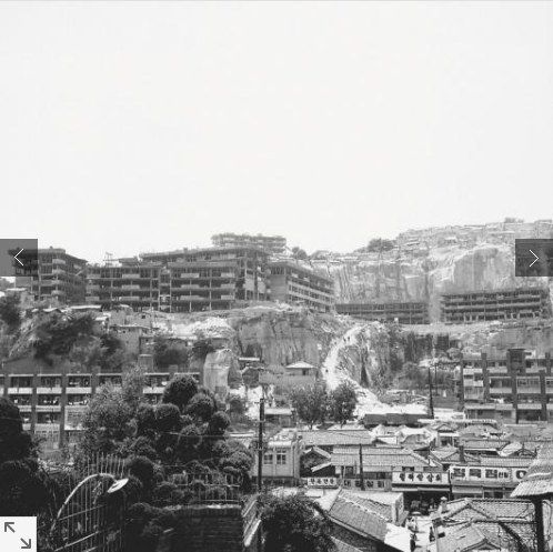 "1969년 낙산 아파트 공사 모습이다. 서울시는 주택난을 해소하기 위하여 1957년부터 단독주택이나 연립주택을 지어 국민주택으로 분양했는데, 1968년 12월 3일 시민 앞 라트 2,000동 건립계획 가운데 창신숭인지구 500평이 선정되었고, 1969년 1월에는 창신동 쪽 낙산지구에 시민아파트 30동의 기공식이 있었다. 3월에는 무허가 건물을 철거하고 이 일대에 아파트를 건설하였지만 와우아파트 붕괴 이후 안전과 경관 등의 문제로 1998년 낙산아파트를 철거하고 낙산 공원화 사업으로 공원을 조성하였다." -내용 출처: 서울역사 아카이브-