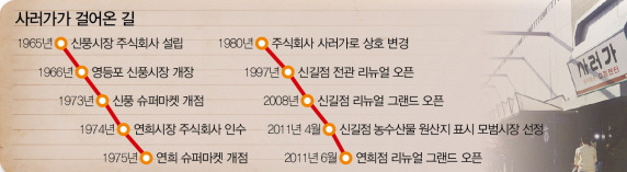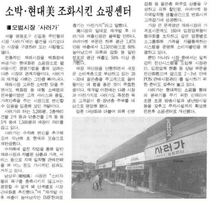 서울 영등포구 신길동 '신풍시장'과 서대문구 연희동 '연희시장'을 운영하고 있는 사러가의 역사는 어쩌면 우리나라 유통 발전사를 그대로 반영한다. 65년 신풍시장을 설립한 사러가는 67년 서울시에서 최초로 재래시장으로는 처음 슈퍼마켓을 도입한데 이어 80년에는 상호를 현재의 사러가로 바꾸면서 대단위 슈퍼체인을 갖추게 되면서 기업의 면모를 일신한다. 이에 앞서 79년 서대문구 '연희시장'을 인수한 것은 시세를 확장하는데 중요한 밑바탕이 되었다. 80년대 불어닥친 유통시장의 대격변기에 사러가는 능동적인 대처로 위기를 모면할 수 있었다. . . (중략)