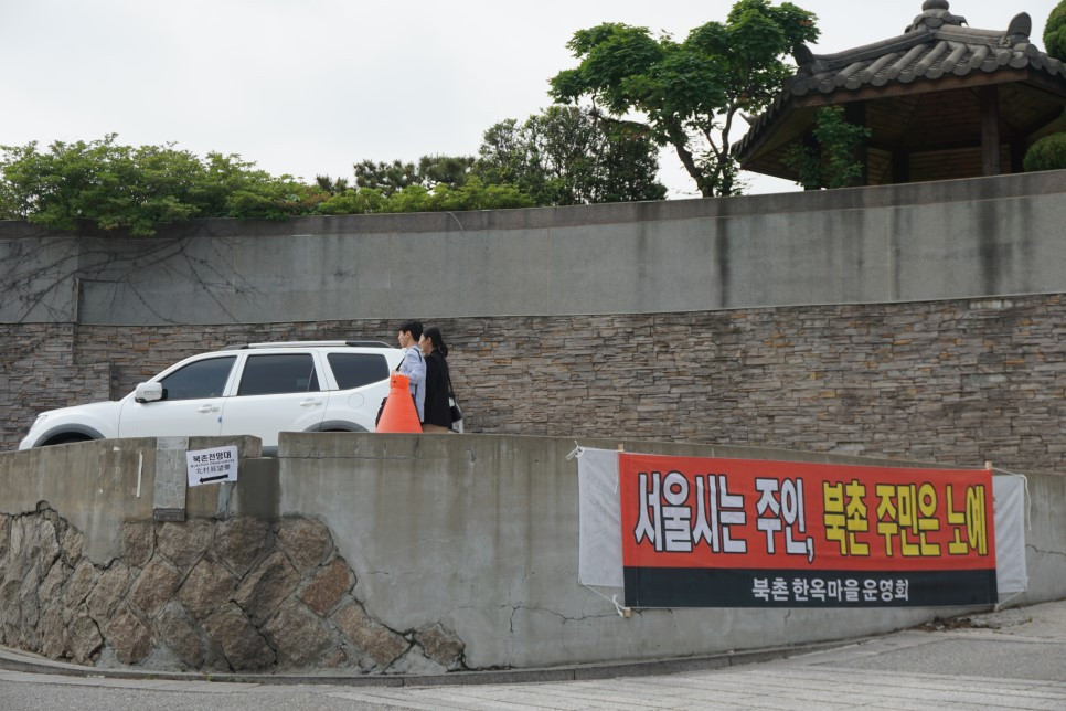 청계천에서 봤던 관광버스는 보이지 않았지만(버스를 세울 만한 마땅한 공간이 없었으므로) 별반 다를 바 없었다. 주변의 풍경 보다 먼저 눈에 들어 오는 건 오르는 길에 빼곡하게 자리 잡은 사람들이었다. 허를 두를 정도의 인파에 한시라도 이곳을 빨리 벗어나야 겠다는 생각이 들었다. 그 순간, 북촌은 내게 더 이상 오고 싶지 않은 장소가 되었고, 나와 멀어졌다. 그랬던 이 곳에 오랜만에 발길이 닿았으나 , 놀랍게도 북촌한옥마을로 향하는 입구서 부터 곳곳에 현수막이 걸려 있었다.