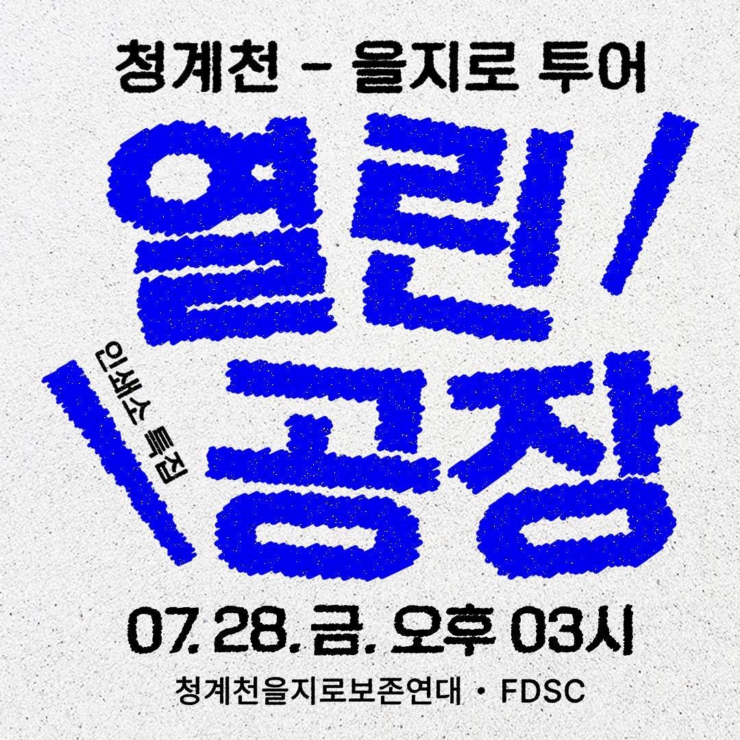 청계천을지로보존연대는 세운 재정비촉진지구, 수표도시환경정비사업 등의 이름으로 재개발될 위기에 처한 청계천-을지로를 지키고자 2018년 말 결성된 예술가, 디자이너, 메이커, 연구자, 시민들의 모임입니다. 우리는 무분별한 재개발로부터 이곳의 가치를 기록하고 알리고 지킬 수 있도록 지역의 상인들과 함께 활동하고 있습니다. 열린 공장 : 청계천-을지로 투어-인쇄소특집 열린 공장 투어! 이번에는 5 세훈 시장님이 다 철거하겠다는 인쇄소 골목을 FDSC 디자이너들과 방문합니다!