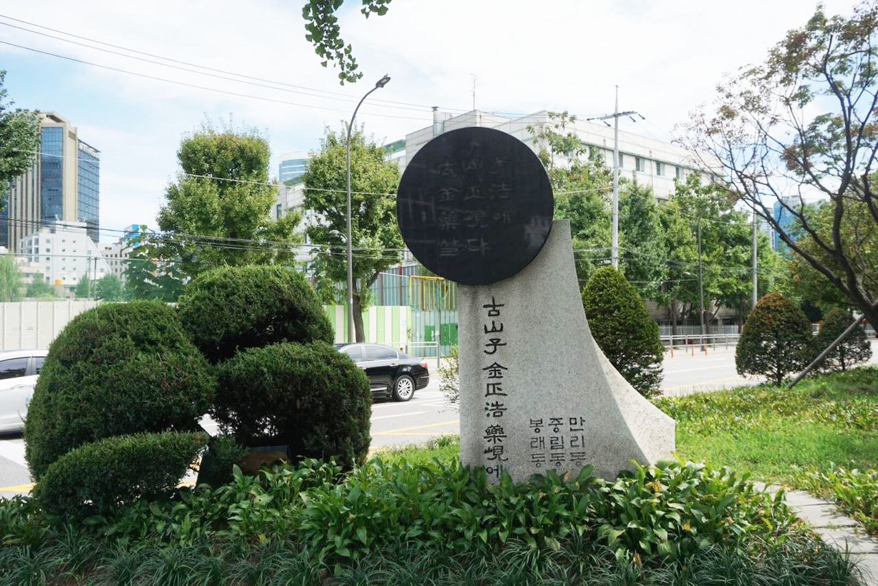 황해도에서 태어났지만 지도와 지리서를 만들기 위해 전국을 돌아다녔을 터. 그가 서울에 머물렀을 때 살았던 곳이 약현이라고 한다. (중림동의 옛 지명이 '약현'이다.) 이를 기념하기 위해 1991년 지금의 중림동 약현성당 앞 로터리에 세워졌다.