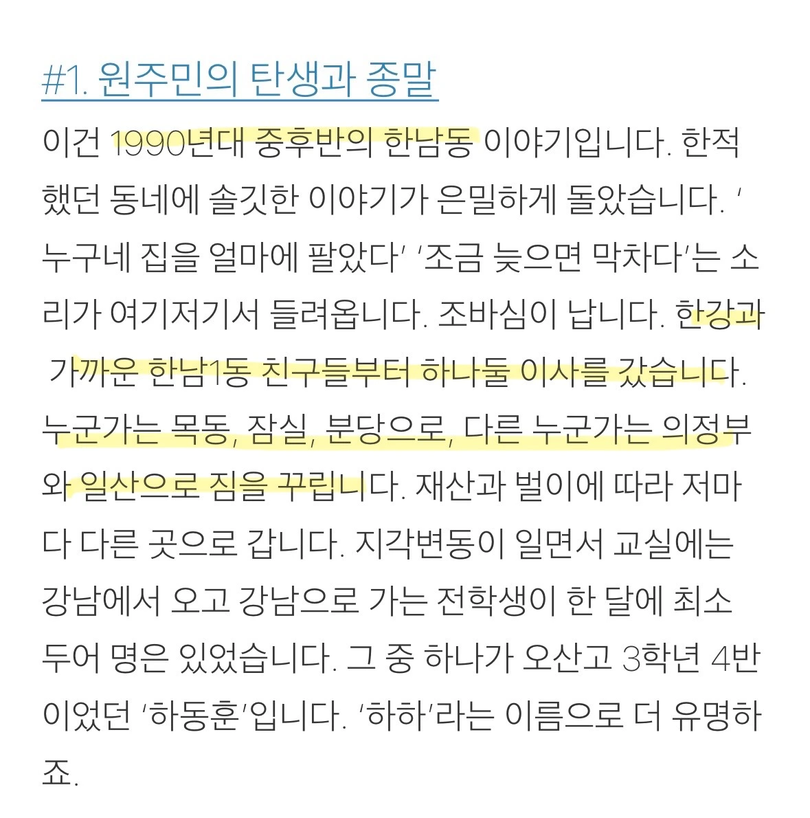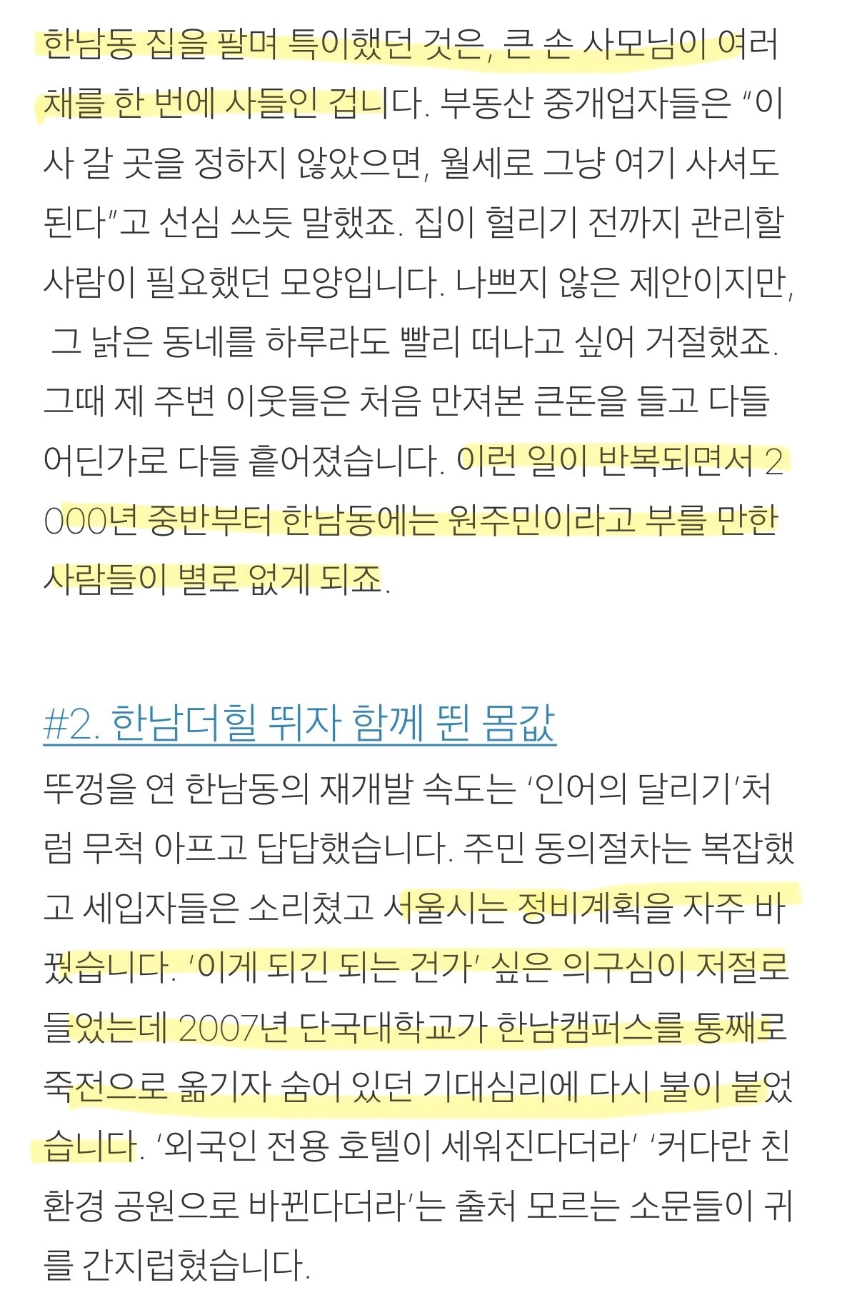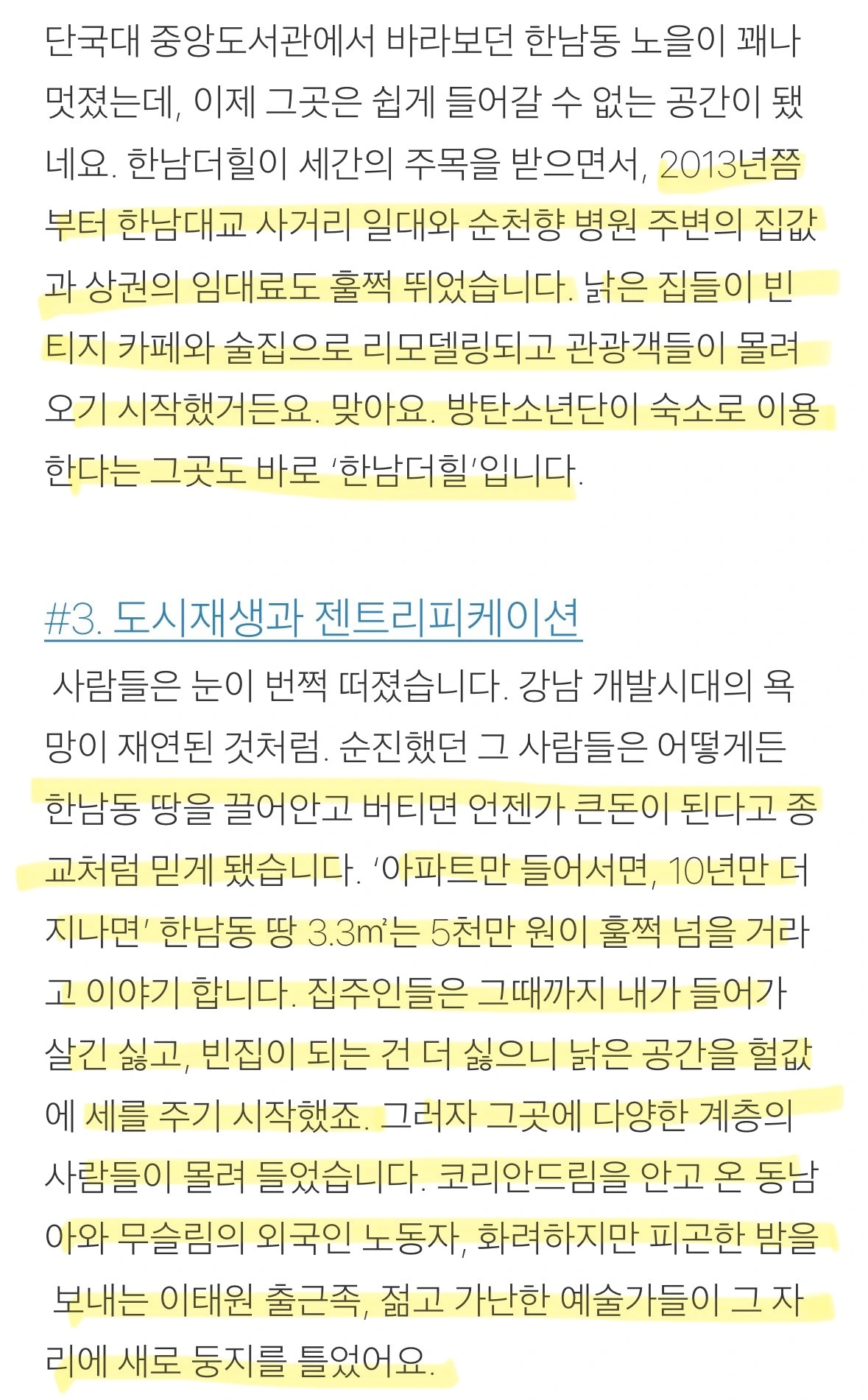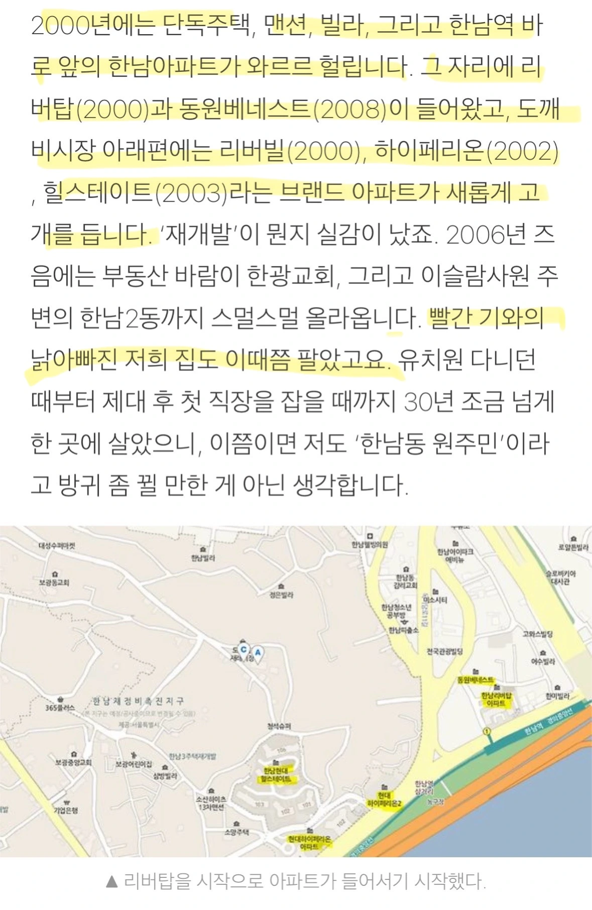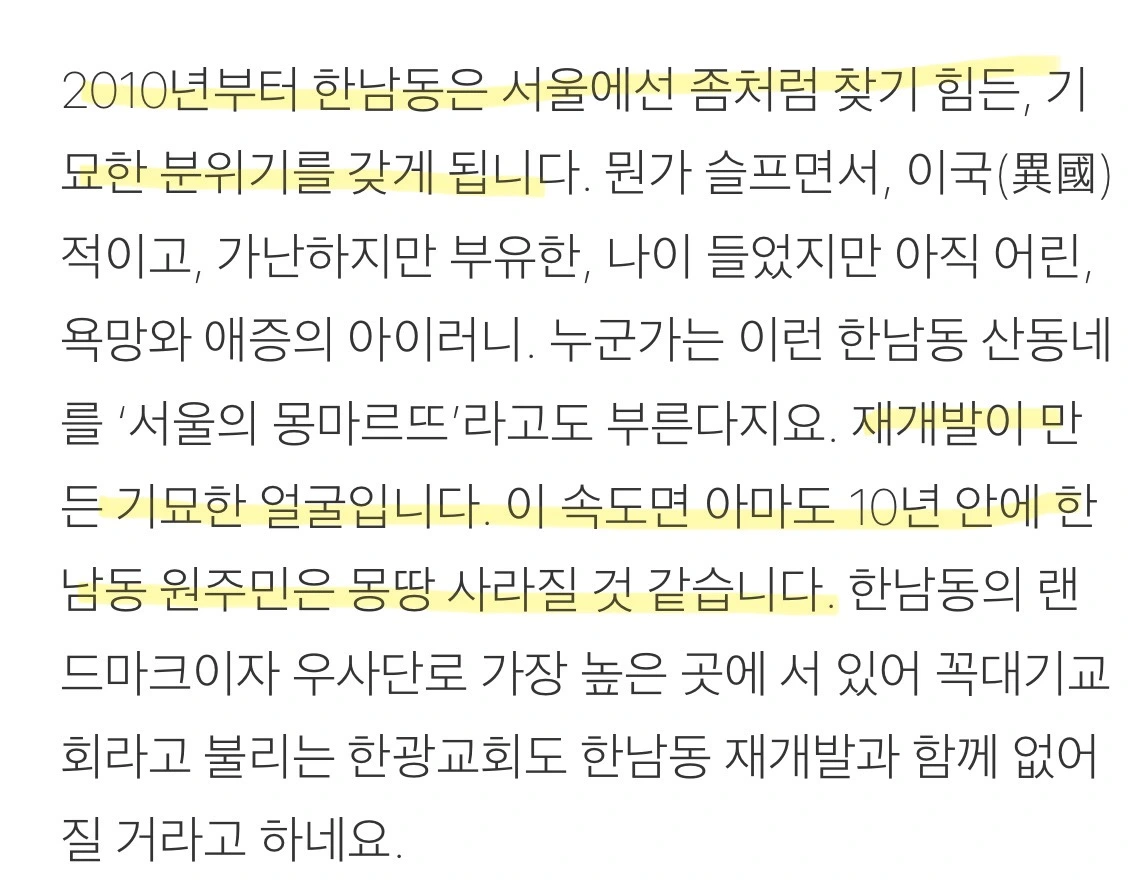 어린 시절을 보광동-한남동 언덕동네에 거주한 글 쓰는 여행자님의 브런치글을 통해 이 일대가 '재개발'이슈로 수십 년간 변화가 있어왔음을 알 수 있었다. 브런치 내용에 기반하여 간략하게나마 정리해 보았다. 정확성을 위해 좀 더 자세한 것은 확인해 봐야겠지만 큰 흐름에서는 참고할만한 내용이라 판단된다. 특히 1990년대 중후반에 원주민들이 이동하는 현상과 2000년대 중반에 큰 손 사모들이 이 일대의 주택을 여러 채 구매하면서 외지인의 비율이 높아졌다는 지점은 주목할 만하다.