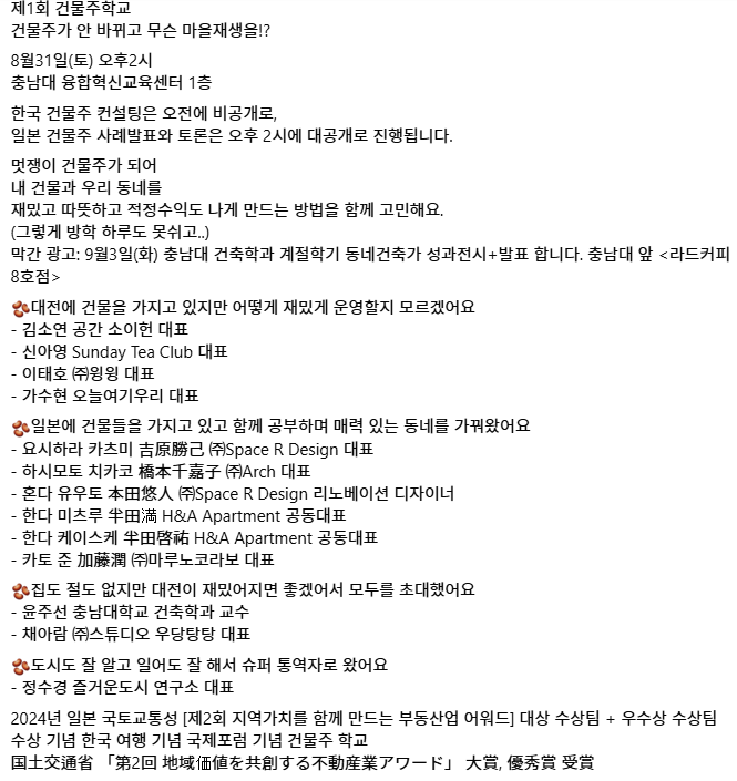 대전 충남대에서 진행하는 <건물주 학교>라는 포럼에 일본 DIY리노베이션 팀이 참석한다고 해서 갔었어요. 규슈, 오사카에서 건물주들이 왔는데 시모노세키에서 온 재일교포 3세 하시모토상이 가장 기억에 남아요. 에너지가 엄청난 분이었죠. 이 분들이 전달이 되는데 듣는 내내 통역이 틀린 건 아닌데 뉘앙스가 달라 추가 설명을 듣지 않고서는 이해하기 어려운 지점이 있었어요. 목마른 사람이 우물을 판다고 관련 자료를 일본어로 찾아보기 시작한 거죠.