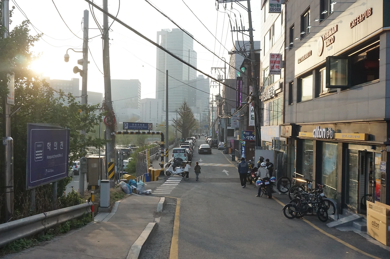 여기 공사하며 역에서 큰 도로를 따라 집 앞까지만 왔다 갔다 했지 여태 마을 안에 들어갈 일이 없었어요. 주택이 많은 줄도 몰랐어요. 초등학교 다닐 때는 대로에서 한 블록 안, 대로변 큰 건물 바로 뒤쪽이 되는 거죠. 거기에 주택가가 있었어요. 그중 한 집에서 피아노를 배웠는데 마당이 꽤 넓은 적벽돌 주택이었어요. 교장 선생님 댁이었던 것 같고 자녀분이 피아노를 쳐서 배우러 다녔어요. 주택가에는 이후에 여관이 들어왔었다고 하더라고요. 지금은 호텔이랑 스크린 골프장이에요. 이렇게 바뀐 지는 몇 년 안 됐대요. 이런 변화에 대해서는 25년쯤 전 마을로 이사 오신 인덕원 터 사회적 협동조합 사무국장님한테 들었어요.
