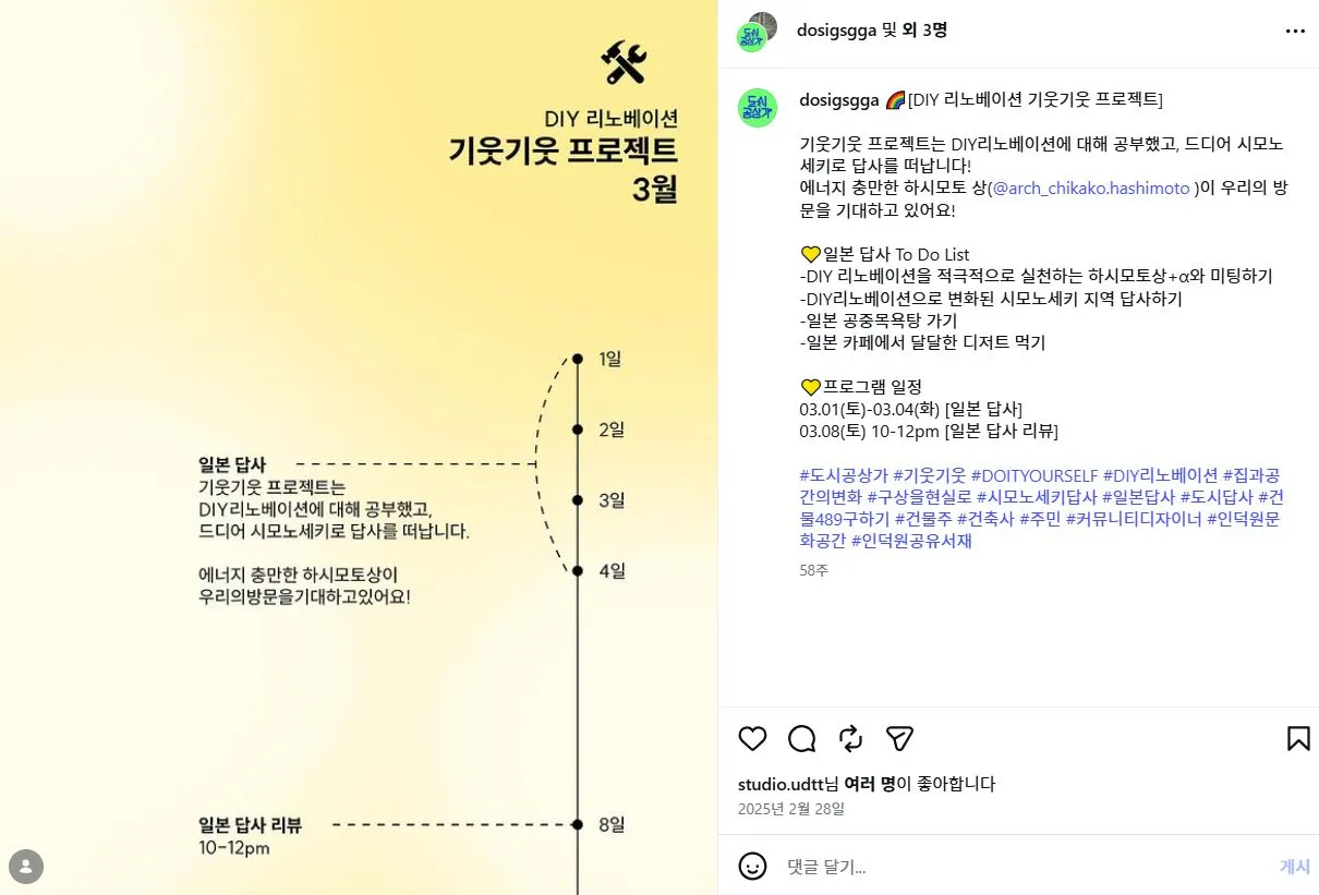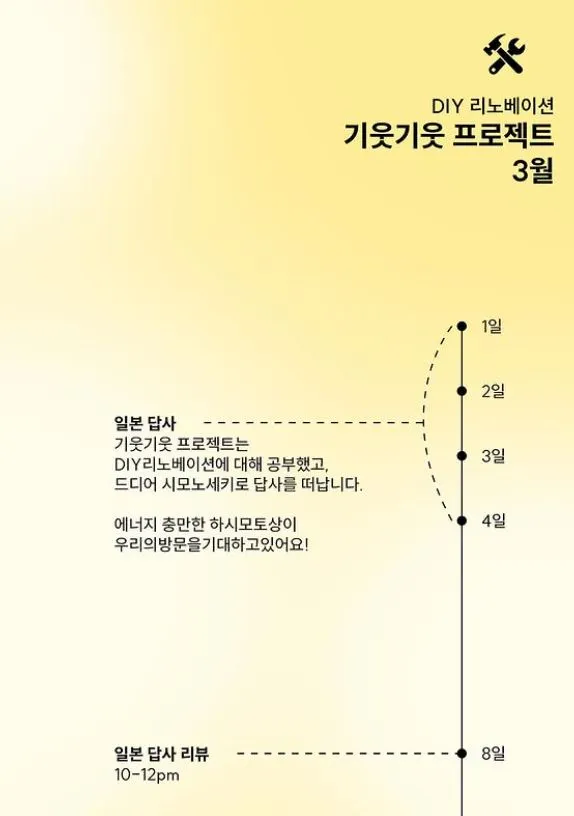 사람들과도 일본에 가서 DIY리노베이션 사례를 보면 좋을 것 같더라고요. 지인과 먼저 일본에 답사를 갔었어요. 놀러 갈 겸 해서 간 거죠. 야마구치 조세이 탄광에 갔다가 시모노세키에서 하시모토상을 만나고 곧 다시 오겠다고 했죠. 그러고 3월에 기웃기웃 팀과 같이 간 거고요. 그때만 해도 DIY 리노베이션이 뭔지 잘 몰랐어요. 다녀오면 이해가 더 잘 될 줄 알았는데 쉬운 개념은 아니었어요. 그래도 다들 평생 기억으로 남을 거라며 너무 좋아했어요. 저는 이전부터 아시아 로컬 분들과 같이 일한 경험이 많은데 기웃기웃 팀 멤버들은 일본 로컬 경험이 처음이라 그 농도가 다를 수밖에 없었을 거 같아요. 매년 11월 둘째 주에는 규슈에서 DIY 리노베이션 위크를 진행하는데 2024년에는 줌으로 보고 정리한 내용을 2025년 기웃기웃 1탄을 시작하면서 공유했었어요. DIY리노베이션에 대해 한번 정리한 거죠.
