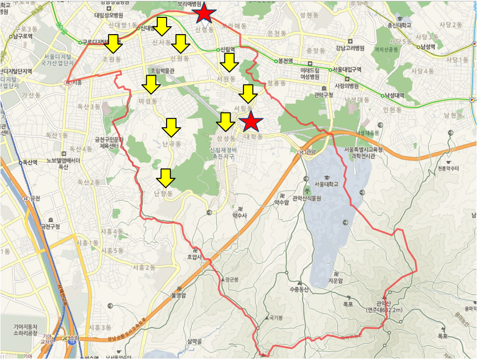 서울 지리를 제대로 파악하지 못한 상태에서 그나마 자주 가는 장소인 강남역, 역삼역과 멀지 않았으면 했다. 시장이나 마트, 24시 편의점, 미용실, 세탁소 같은 편의이용시설이나 식당, 카페 같은 음식점이 가까이에 있고, 언제 닥칠지 모를 위험에 대비하여 도움을 청할 수 있는 환경에 위치한 곳이면 딱 좋겠다 싶었다. 이 조건에 가장 부합하는 장소는 어딜까 따져 보았더니 다름 아닌 신림역 인근. 방 크기가 작아 다소 불편할 지언정 이곳에 살아야 겠다고 결정했다.