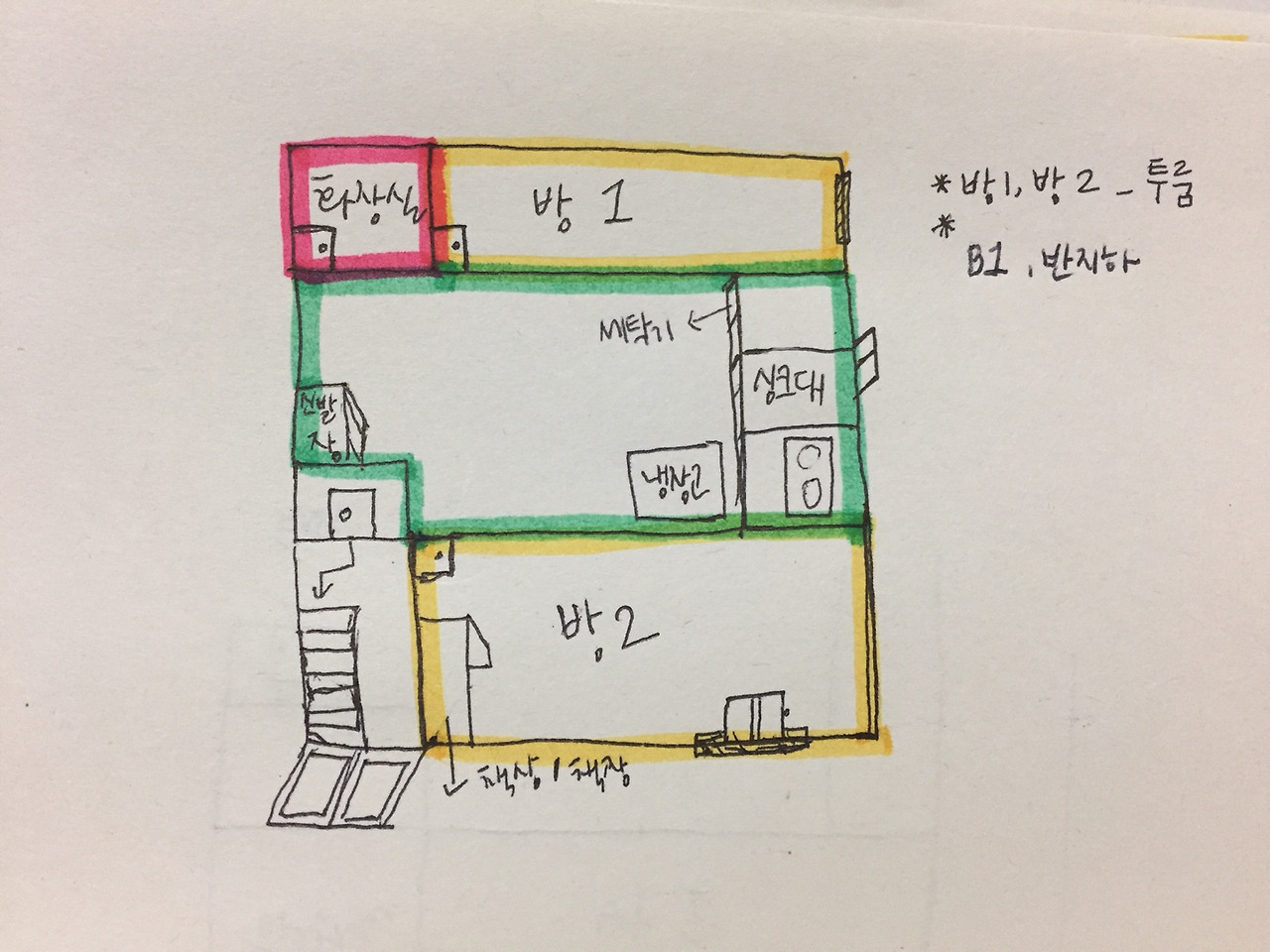 그렇게 더도 말고 덜도 말고 '저렴한 방 값'을 부르짖으며 방을 알아보던 중에 생각지도 못하게 원룸과 투룸이 같이 있는 집을 보게 되었다. 동생과 이미 따로 살기로 합의한 상태였던지라 기대 없이 온 김에 한번 보라고 해서 봤는데, 생각보다 방 크기도 크고 신축건물이어서 그런지 여태 보던 집들과는 다르게 깨끗했다. 깨끗해 보이는 것일 수도 있겠지만, 사람이 살지 않는 상태에서도 깨끗함을 유지하고 있다는 것에 더 신뢰가 갔다. 반지하층이라 조금 마음에 걸리긴 했지만 흔히 우리가 알고 있는 반지하 방처럼 빛이 아예 들어오지 않는다거나 사람들이 드나드는 길이 지나가는 것도 아니라는 점도 한몫을 했다. 투룸이라 보증금 금액이 좀 더 높았지만 원룸에 살 때 보다 사용하는 공간이 넓어졌고, 감당해야 할 월세 부담이 줄어들었다. 결국, 나와 동생은 다시 함께 살게 되었다.