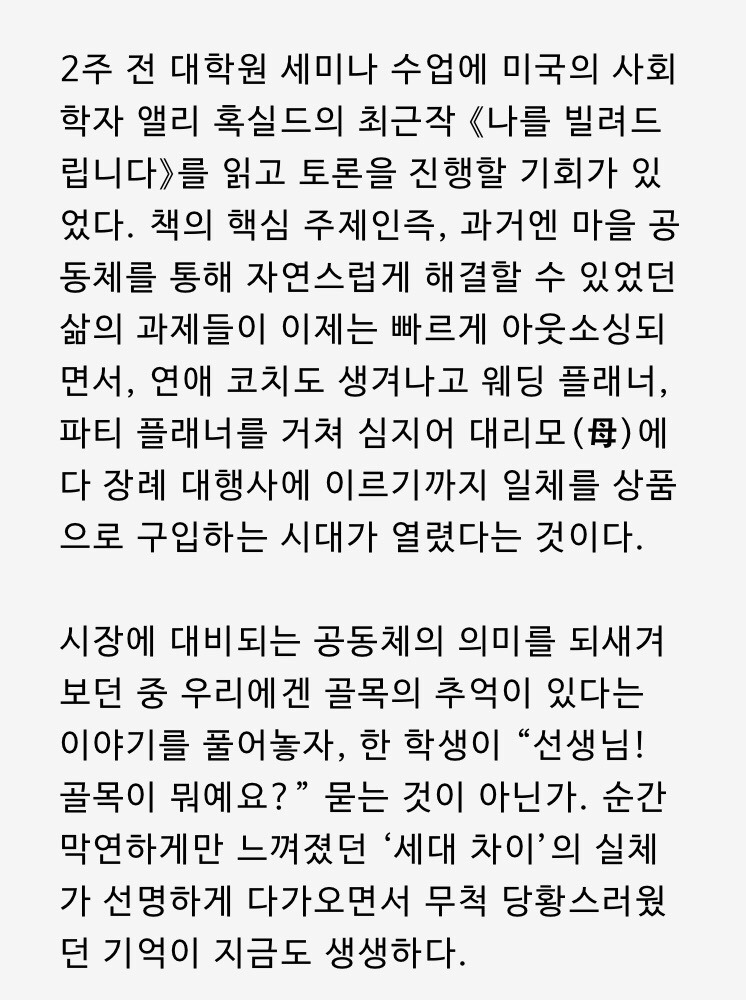 함인희 이화여대 사회학과 교수가 수업 중 겪었던 일화는 골목의 존재조차 모르는 이들이 존재한다는 것을 증명해주는 좋은 사례다.