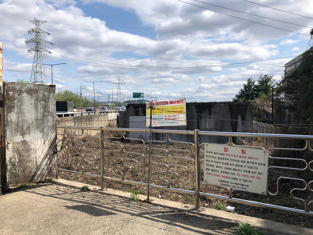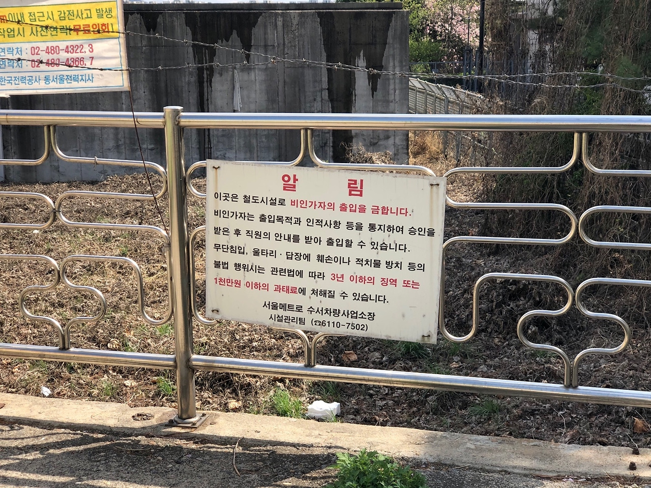 근처를 배회하며 걷다 보면 동부간선도로가 보인다. 이 도로만 건너가면 송파구 문정동이다. 쌩쌩 달리는 차들 사이로 보이는 무언가의 알림. 잘 들여다보면 수서 차량사업소에서 안내한 출입금지 내용이다. 여기까지도 수서 차량기지에 속하는 구역임을 잘 알 수 있다.
