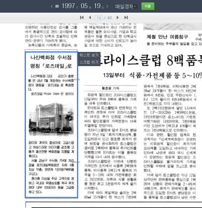 특별한 역사와 함께 특별한 건물도 있다. 지하철 수서역 출구를 빠져나오자마자 보이는 고층건물 몇 개. 그중에서도 네모난 유리창문으로만 꽉 채워진 반듯한 모양의 수서타워 건물과 달리 모서리가 둥근 오피스텔 건물이 유독 눈에 들어왔다. 건물 이름이 '로즈데일'. 심상치 않다. 아니나 다를까 이 건물은 1997년 개점을 앞두고 있던 나산그룹의 로즈데일 백화점 건물이었다. 1년도 채 되지 않은 1998년 나산그룹의 부도로 개점은 하지 못했지만 그때 그 모습 그대로 오피스텔로 사용 중이었다. 회사가 부도가 났다고 해서 건물을 부수고 새로 지은 것이 아니라 용도만 변경하여 그대로 사용하고 있는 것이 나름 마음에 들었다.