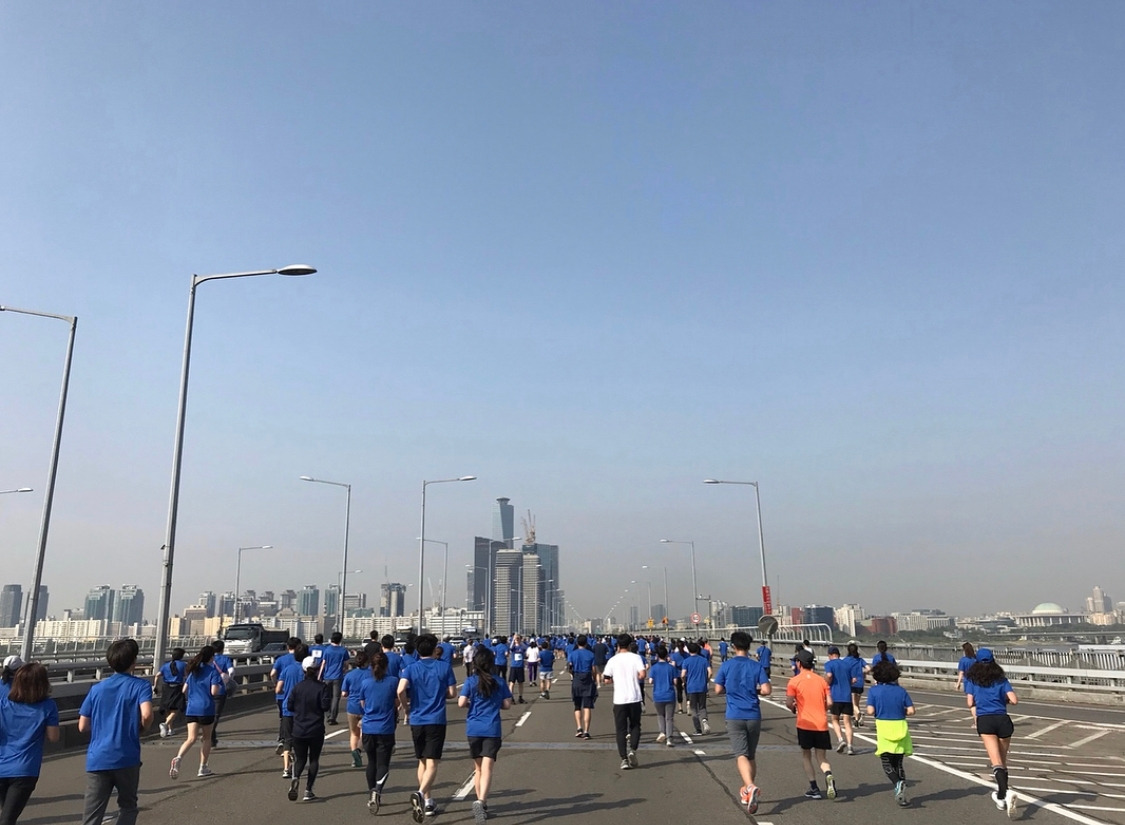 5km 구간이 지나면 곧 마포대교가 나온다. 내가 제일 좋아하는 구간이다. 평소에는 달리는 차 안에서만 지날 수 있는 곳이지만 내 두 발로 차선 위를 달리는 그 순간엔 생전 처음 느끼는 새롭고 짜릿한 경험을 할 수 있다. 처음 보는 사람들이지만 다 같은 지점을 향해 도로 위를 달리는 그 광경도 꽤 진귀하다.
