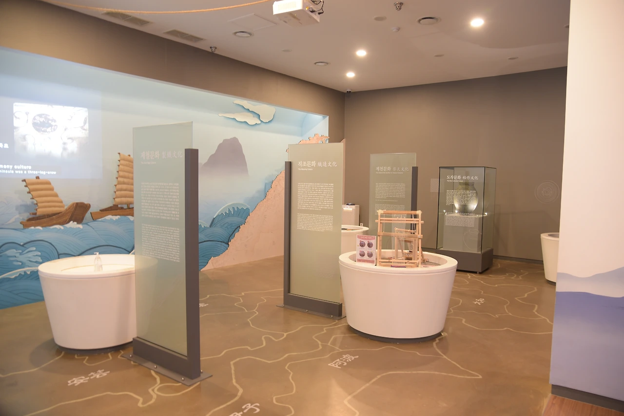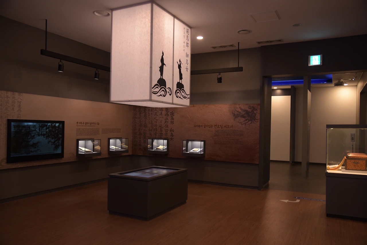 귀비고 전시관 전경들. (왼쪽) 신라 일월신화를 기록한 한일 고서들. (가운데) 일본으로 간 신라인이 전해준 문화들 (오른쪽) 동아시아 일월신앙 소개