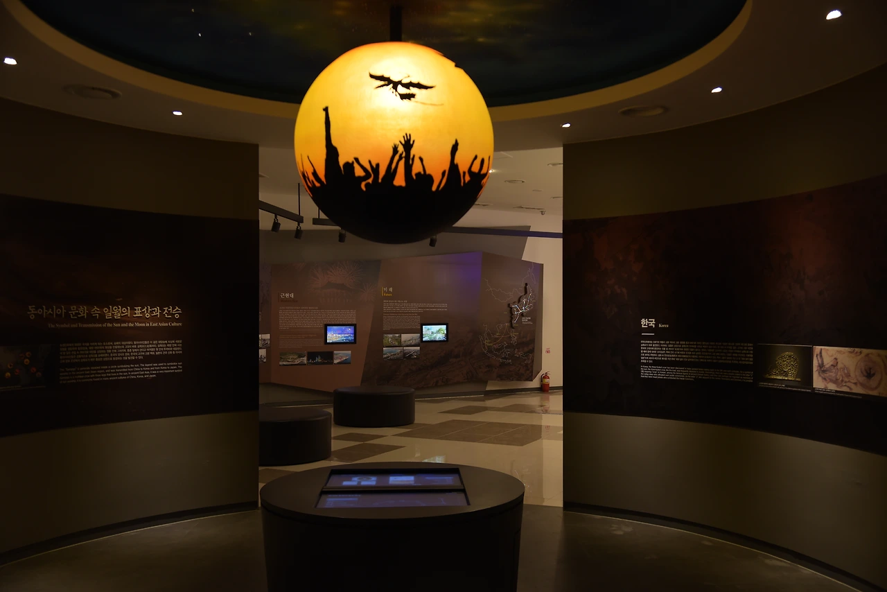 일월 신앙의 전래에 대해서도 잘 전시했다. 바로 삼족오에 대해 전시한 것. 20년 전 드라마 주몽이 시작할 때 나오는 새가 삼족오라 이제는 누구나 다 안다. 삼족오는 태양 안에 사는 세 발 달린 까마귀를 상징하는데, 한중일 모두가 공유하는 상징이다. 중국에는 양사오 문화, 한국 고구려 고분 벽화와 일본 건국신화와 연관이 있다는 것. 그러고 보면 연오, 세오 이름의 오(烏)는 까마귀를 의미한다. 게다가 직물을 짠 걸로 하늘에 제사를 지냈다는 기록으로 보아 일월제를 주관하는 제사장이었다고 말하는 이도 있다. 그리고 이 일월 신앙이 이들의 기술 전파와 함께 일본까지 전래된 것.