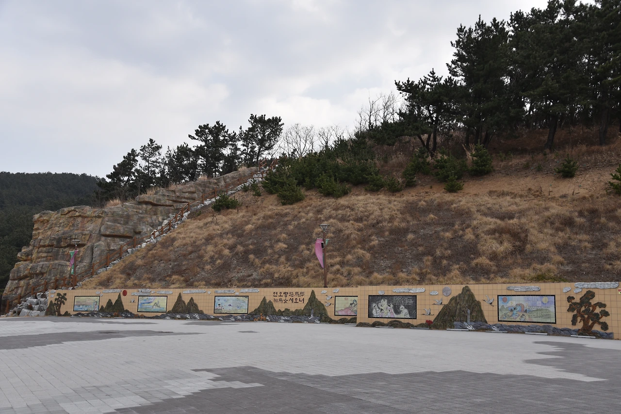 입구에 들어서면 연오랑 세오녀 이야기를 벽화로 반겨준다. 아이들이 잘 볼 수 있도록 만들어놓았다. 이야기를 잊어버렸다면 반드시 벽화를 보고 오기를 추천한다. 벽화 왼쪽에 기암절벽이 있는데 산마루 정자로 가는 계단이 있다. 높은 곳에서 드론 없이도 공원 전경을 감상할 수 있을 것이라고 기대하고 계단을 올라갔다. 산마루 정자에 도착했지만 앞에 빽빽한 소나무가 시야를 가려서 공원 전경을 도저히 볼 수 없어 아쉬웠다.