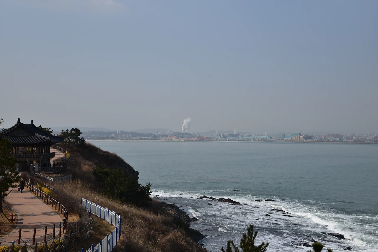 일월정 바다 건너로 포항제철이 보인다. 1,850년 전 신라인들은 일본에 철기를 전해주었다. 그리고 1970년대에는 일본의 도움으로 포항제철을 설립했다.