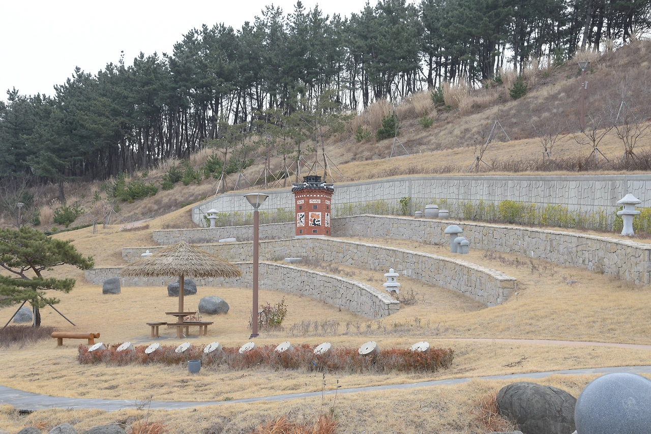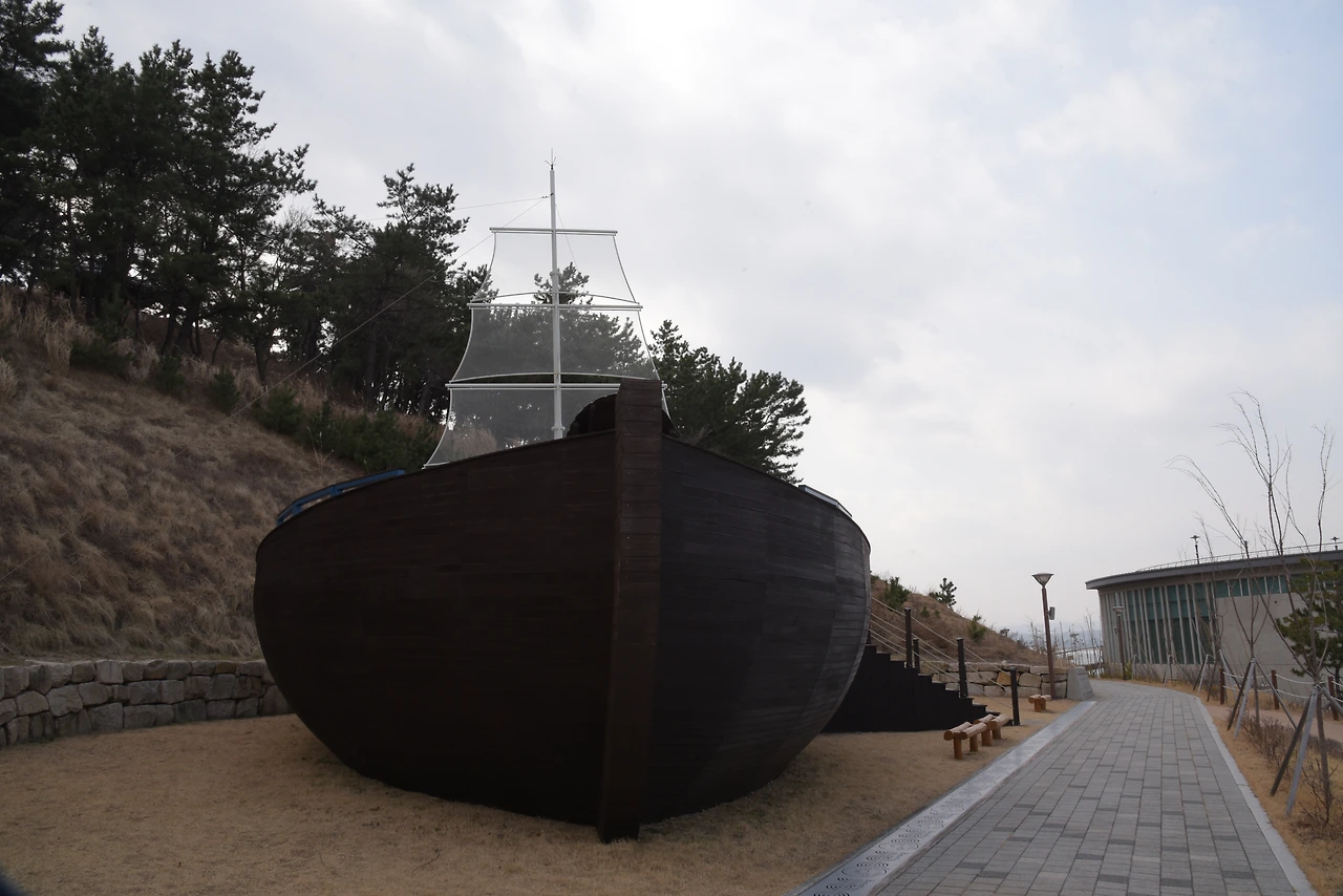 귀비고를 나오면 옆에 한국과 일본의 정원들을 꾸며 놓았다. 아무래도 한일 교류의 역사를 상징하기 위해 조성해 놓은 것 같다. 정원 위에는 배 모양으로 만들어 놓은 나루쉼터가 있는데, 아무래도 관광객의 편의를 위해 만든 것 같다. 옛 신라 가야 고분에서 6세기에 제작한 고대 배 모양 토기가 있는데, 뱃몸이 홀쭉한 토기와 비교하면 너무 퍼져있다. 배 앞에는 커다란 나침반이 있는데, 블라디보스토크, 도쿄, 상하이 등 한중일 주요 도시의 방위(方位)가 어떻게 되어 있는지 잘 설명해 준다.