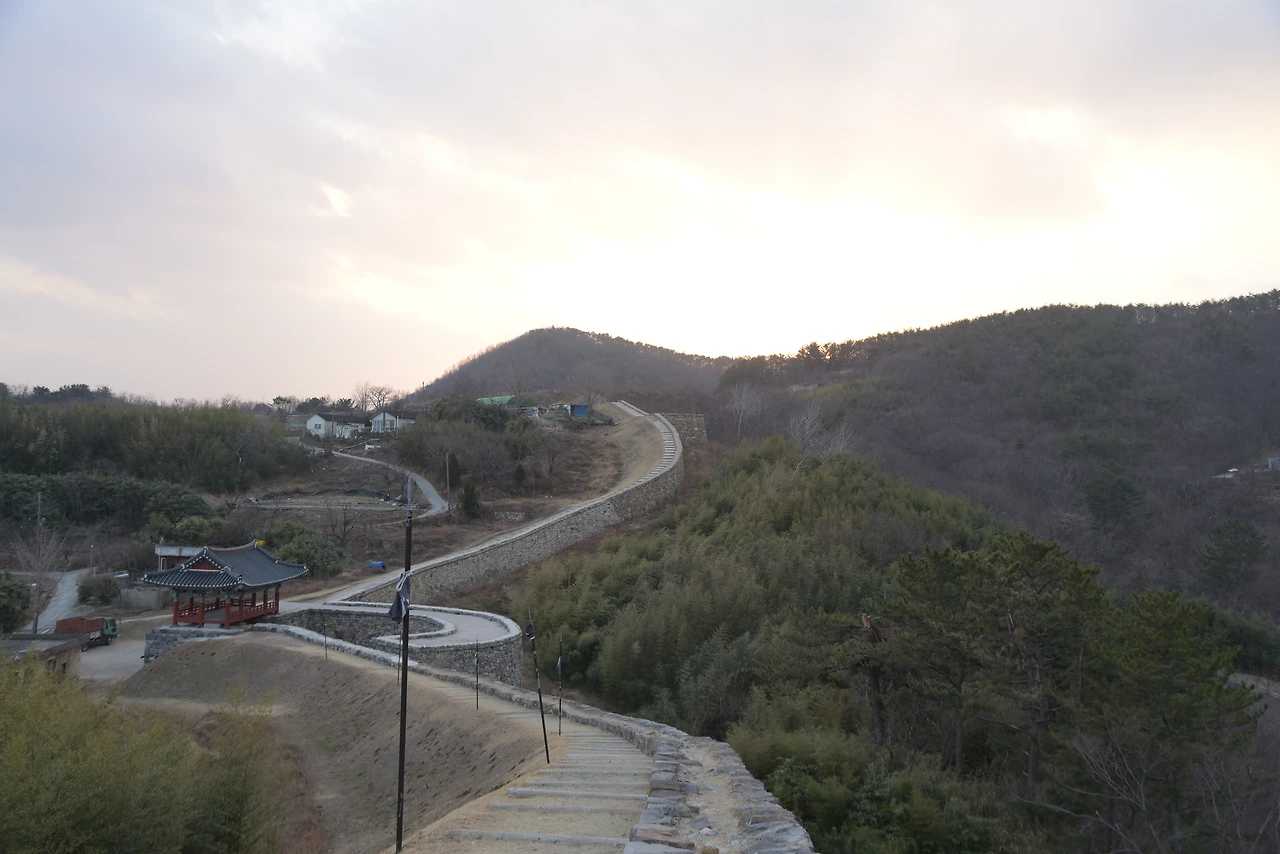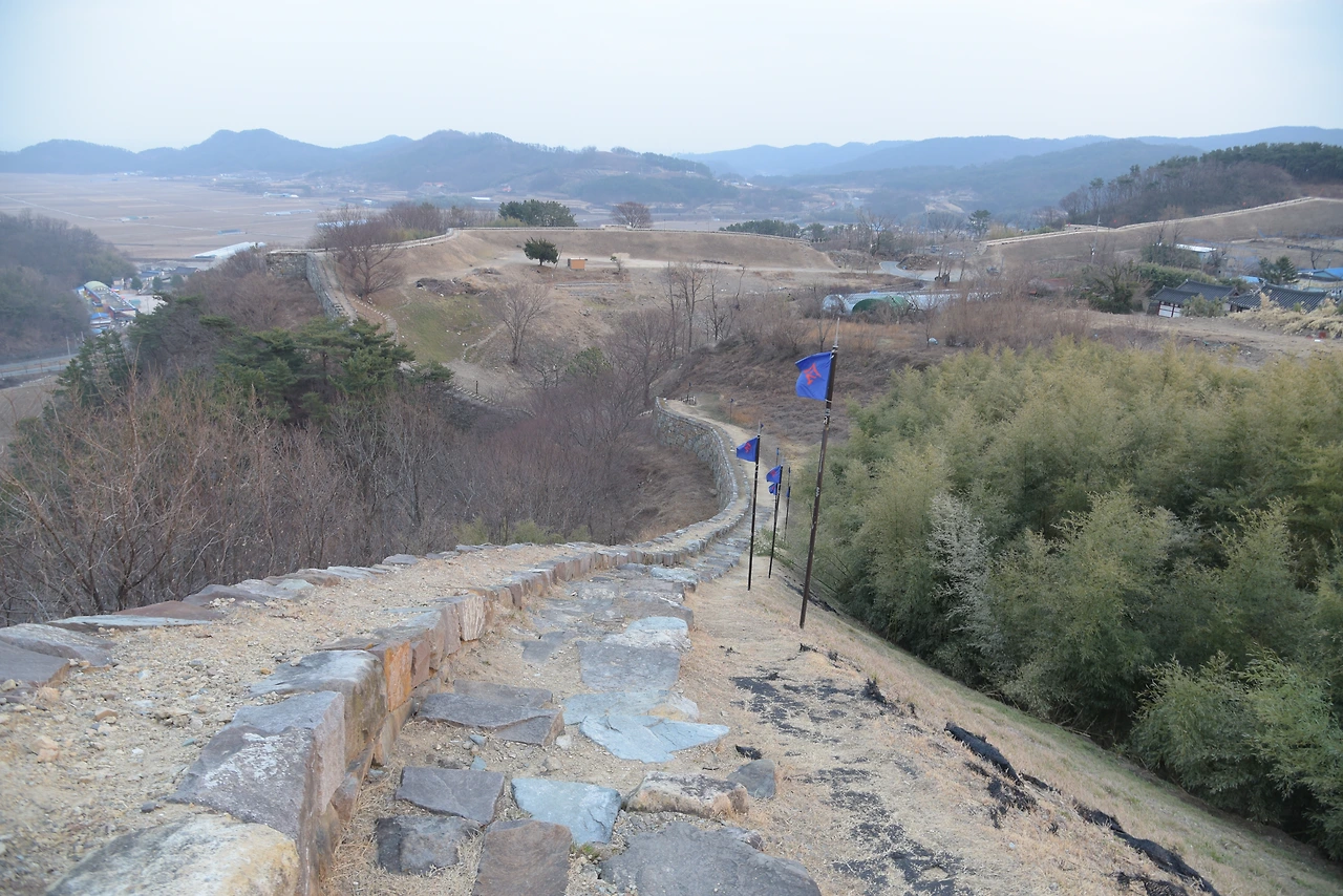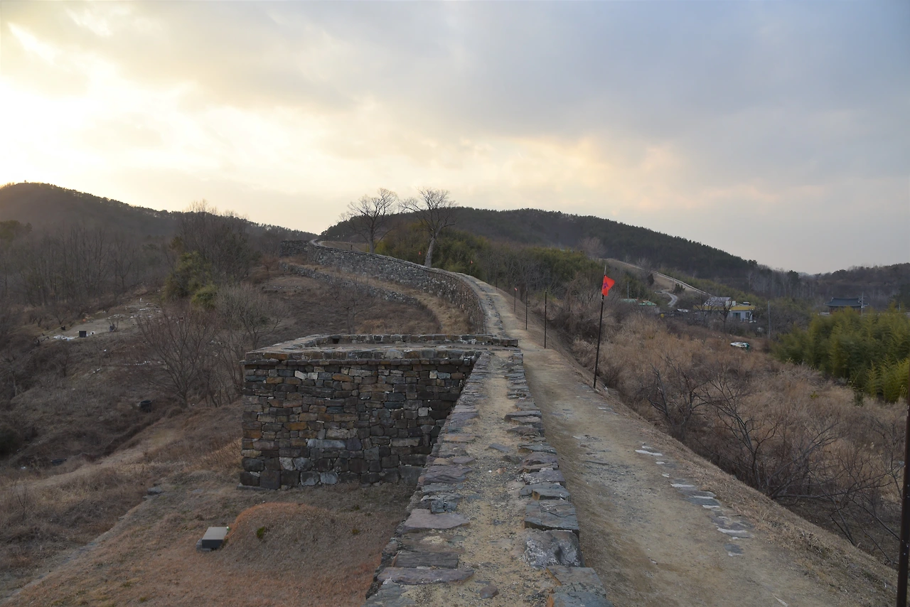 읍성입구로 들어갔는데 아무래도 성문터로 보인다. 성문터 주변 성벽들이 아스팔트길로 많이 훼손되었는데, 옛 읍성 안에 주민들이 살고 있어서 그렇다. 주민들의 편의도 생각해야 하는지라 성문 복원이 쉽지는 않을 듯하다. 하지만 성벽 길은 매우 잘 정비되어 있었다. 성벽 옆에 ‘금(今)’으로 써진 깃발을 두어 실제 병사들이 주둔한 느낌도 들었고.