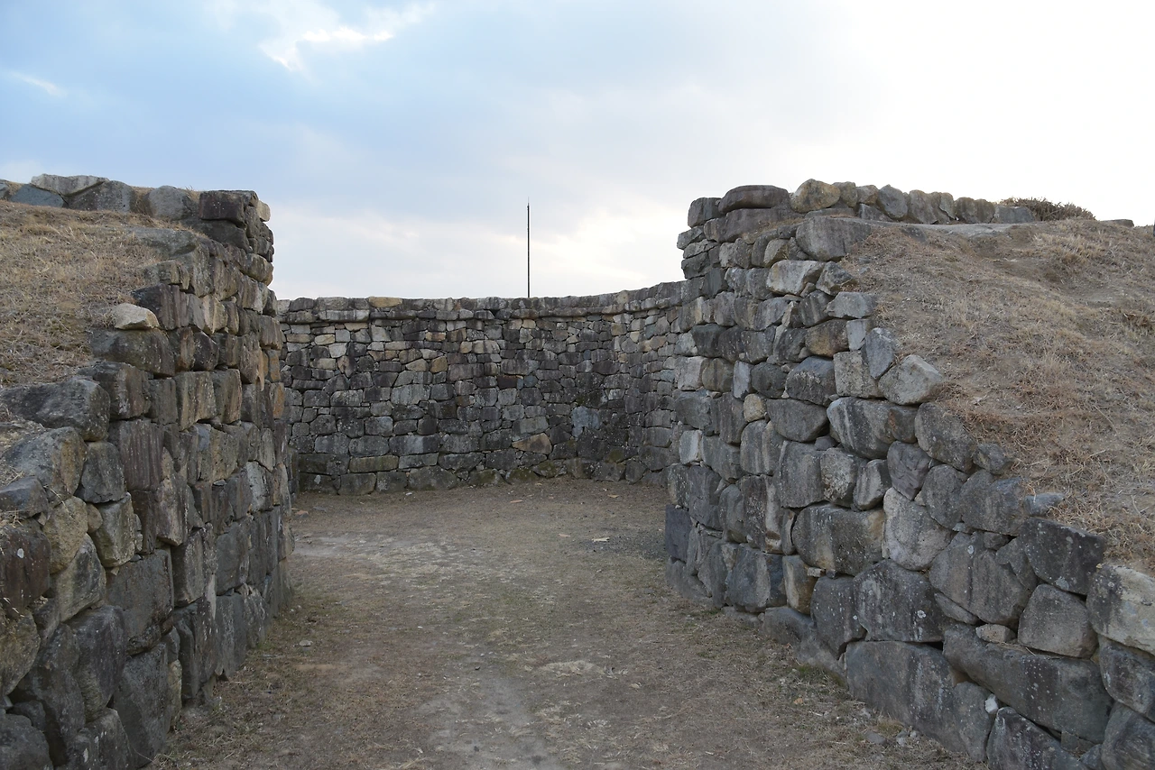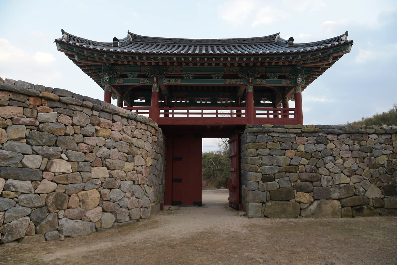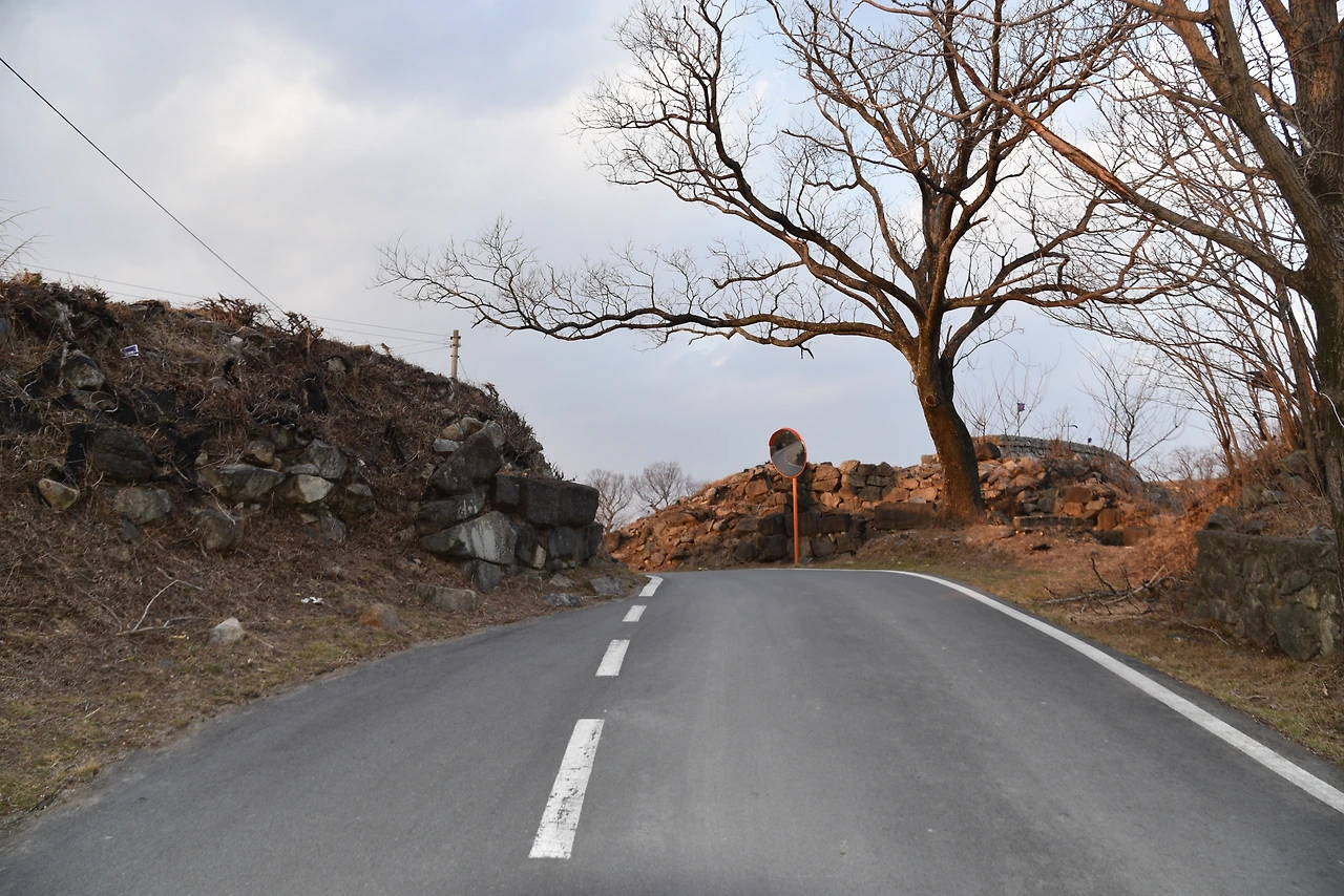 읍성입구로 들어갔는데 아무래도 성문터로 보인다. 성문터 주변 성벽들이 아스팔트길로 많이 훼손되었는데, 옛 읍성 안에 주민들이 살고 있어서 그렇다. 주민들의 편의도 생각해야 하는지라 성문 복원이 쉽지는 않을 듯하다. 하지만 성벽 길은 매우 잘 정비되어 있었다. 성벽 옆에 ‘금(今)’으로 써진 깃발을 두어 실제 병사들이 주둔한 느낌도 들었고.