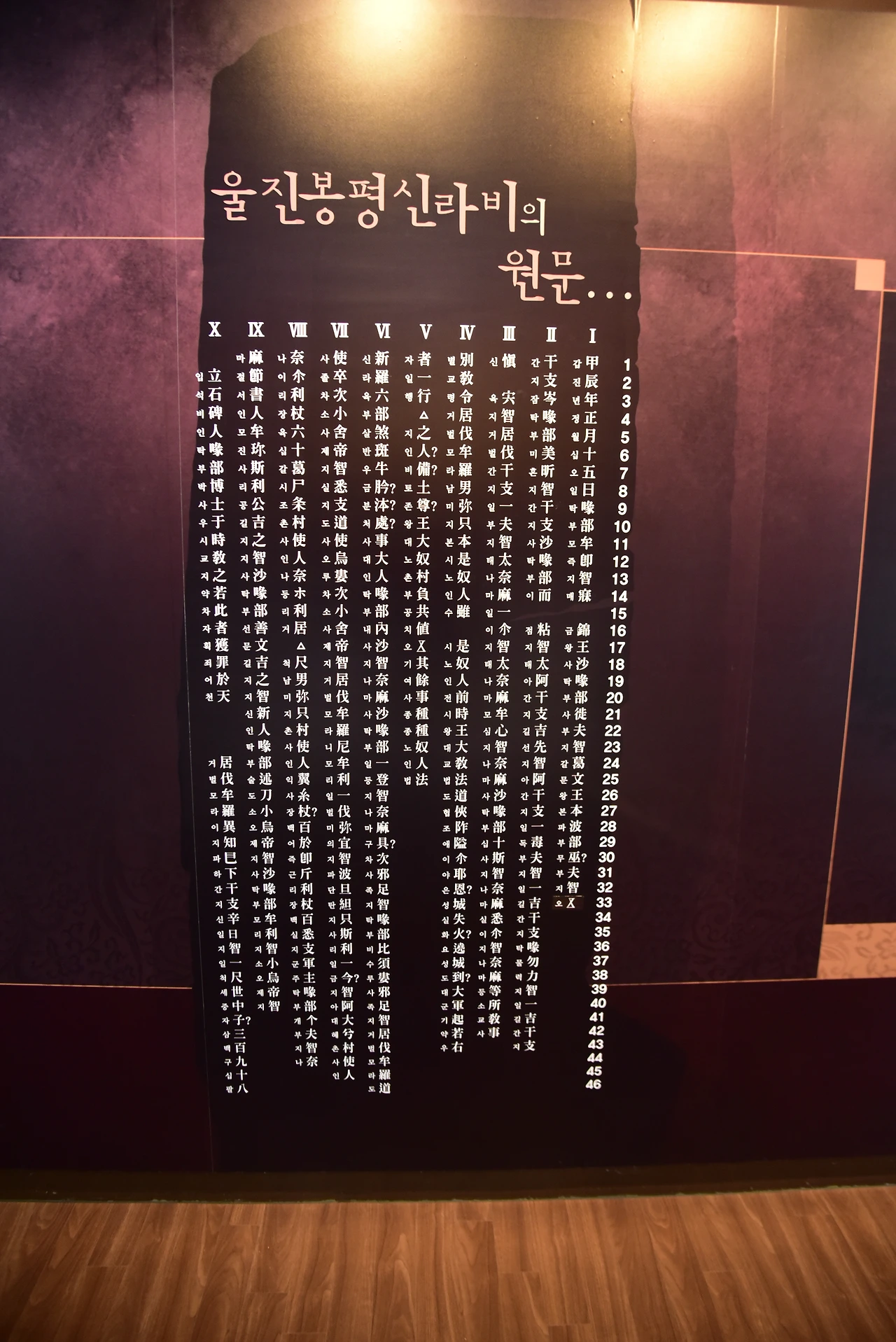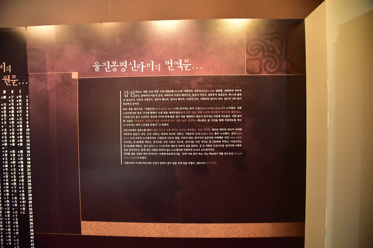 전시관에 들어가면 기다란 울진 봉평리 신라비가 위용을 드러내고 서 있다. 넓게 네모난 돌로 이뤄진 냉수리 신라비와 비교하면 길지만 가늘고 뾰족하게 보인다. 울진 봉평리 신라비는 그럼 언제 발견되었을까? 때는 1988년 1월 20일 무렵 농민 주두원 씨가 논에서 객토작업을 하다가 돌이 거꾸로 박혀 있는 것을 발견한다. 주 씨는 이 돌이 농사를 짓는데 방해가 된다고 생각해서 굴착기를 불러 돌을 드러내 개울가에 버렸다고. 두 달이 지나고 마을 이장 권대선 씨가 이 돌을 자기 집 마당에 정원석으로 쓰려고 했는데, 물로 씻어서 봤더니 글자가 있었다. 글자를 보자마자 권 씨가 죽변면사무소와 울진군에 신고해서 이 비석이 세상에 알려지게 된다. 굴삭기로 비석을 드러낼 때 일부 글자가 떨어져 나갔는데, 다행히 현장에서 떨어진 파편을 찾아서 복구할 수 있었다고 한다. 삼국유사와 삼국사기와 같은 문헌에 없는 6세기 귀중한 신라 재판기록이라서 같은 해 11월 4일 국보 제242호로 지정되었다. 발견 경위가 냉수리 신라비와 비슷하다. 혹시 동해안 지역에서 농사를 짓다가 큰 암석을 본다면 한자가 적혀있는지 꼭 확인해 보시기 바란다.