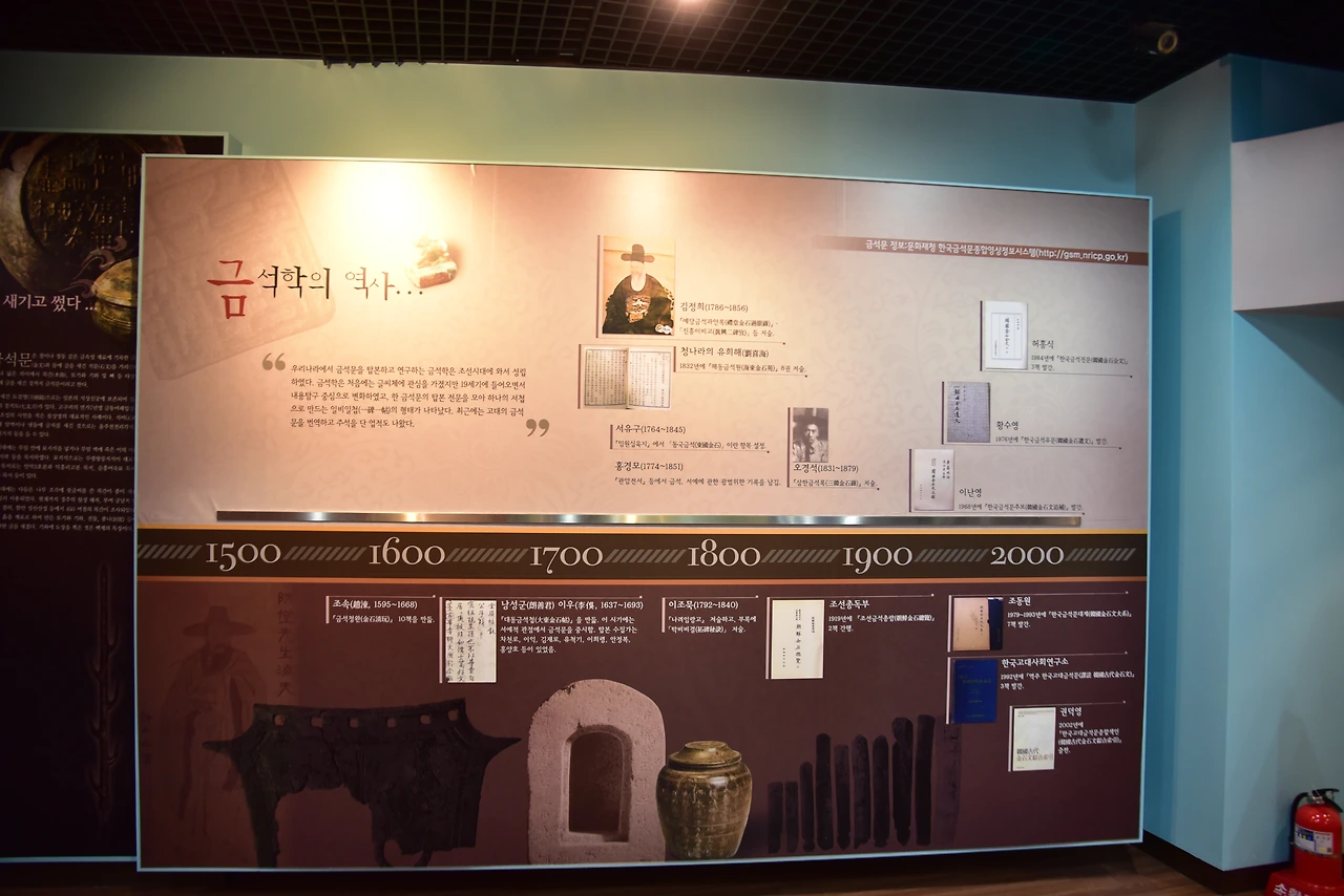 그리고 우리나라 금석문 연구의 역사에 대해서도 잘 전시해 놓았다. 금석문 연구는 조선시대에 와서 성립되었는데, 처음에는 글씨체와 이를 옮기는데 관심을 가졌지만 19세기 추사 김정희의 영향으로 인해 내용 탐구 중심으로 바뀌었다고. 그는 금석과안록에서 진흥왕 순수비인 황초령비와 북한산비의 비문을 판독하고 고증하는 글을 썼는데, 오늘날 금석문 논문과 비교해도 뒤떨어지지 않는다고 한다. 신라비에 있는 관등을 오늘날 해석할 수 있는 것도 추사의 연구 때문이다. 금석문 역사를 다음에는 한자의 서체에 대해 소개했다. 전서, 예서, 초서, 해서, 행서…… 한문 시간 때 얼핏 들은 내용이다. 서체마다 유행했던 시기가 있어서 비문이 언제 쓰였는지 추정이 가능하다고 한다. 그리고 삼국시대 때 고구려, 백제, 신라의 서체도 미묘하게 다르다고.